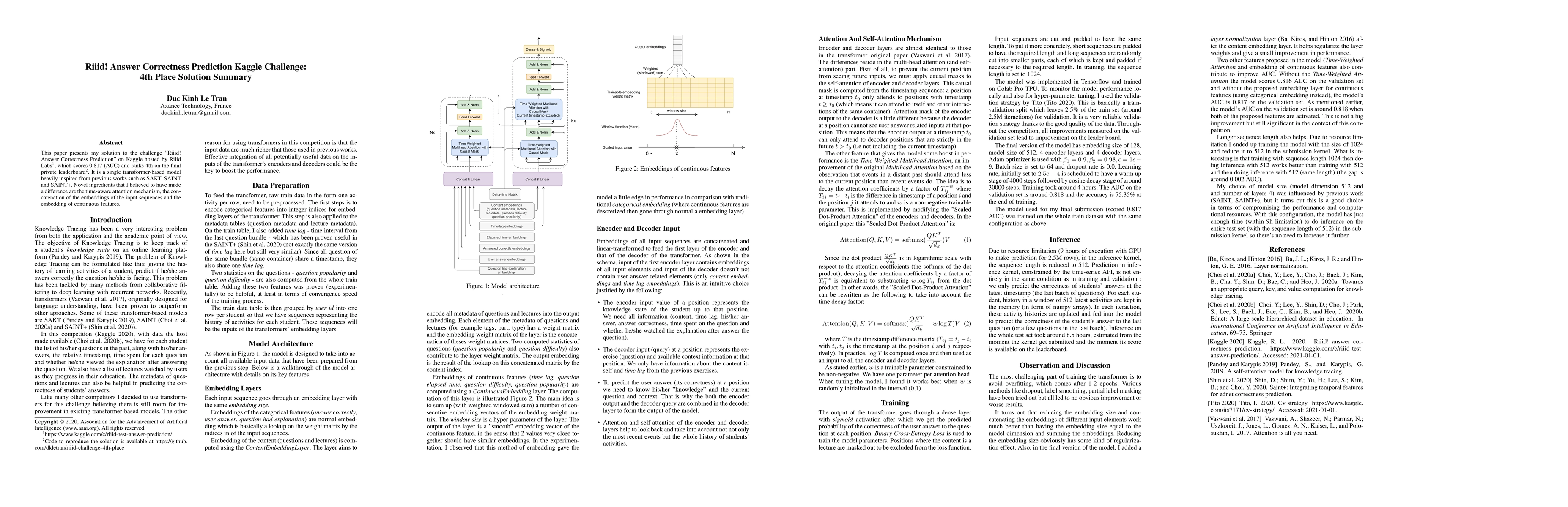 This paper presents a transformer-based model for the Riiid! Answer Correctness Prediction Kaggle Challenge, achieving a 0.817 AUC score and ranking 4th place. The model incorporates novel features such as time-aware attention and concatenation of input embeddings.