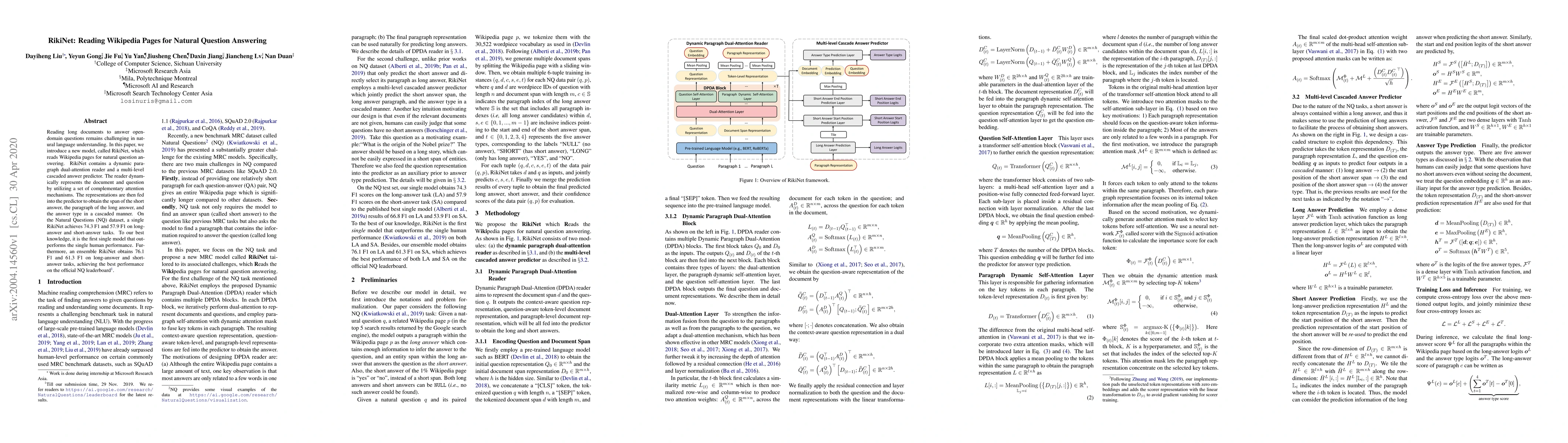 RikiNet is a model designed to read Wikipedia pages for natural question answering, featuring a dynamic paragraph dual-attention reader and a multi-level cascaded answer predictor. It achieves superior performance on the Natural Questions dataset, outperforming single human performance and setting new records in both short and long-answer tasks.