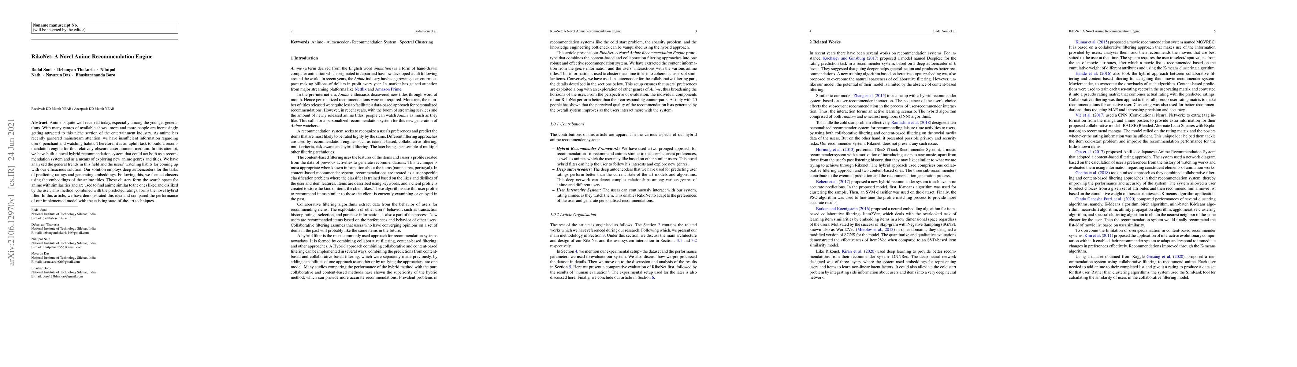 The paper introduces RikoNet, a hybrid anime recommendation engine that uses deep autoencoders and clustering to predict user ratings and explore new anime genres. The system outperforms existing techniques by combining predicted ratings with clusters of similar anime titles.