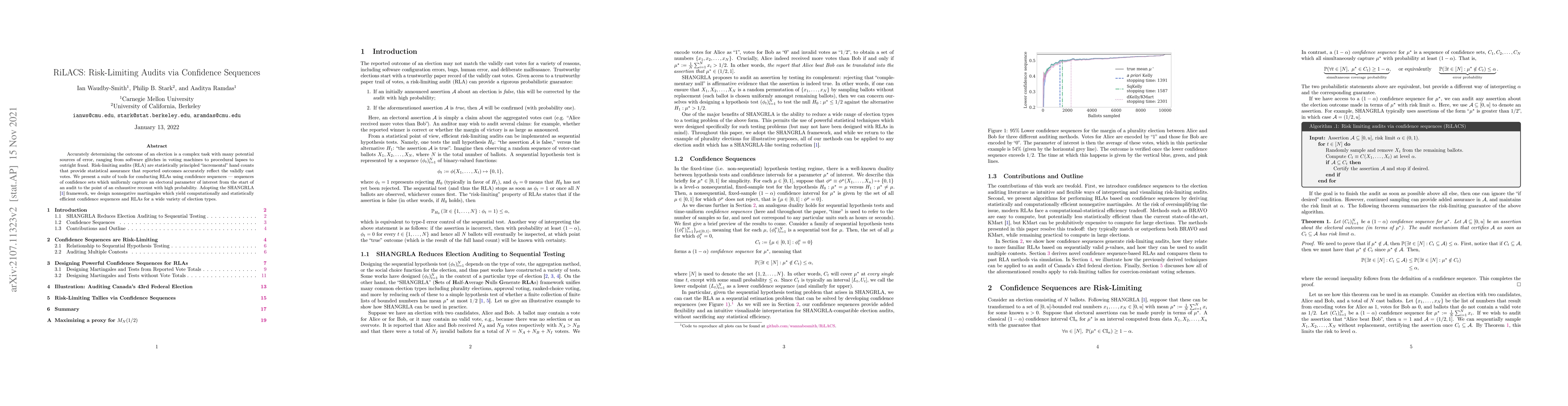 The paper introduces computationally and statistically efficient nonnegative martingales for designing confidence sequences and RLAs, which can be adapted to a wide variety of election types.