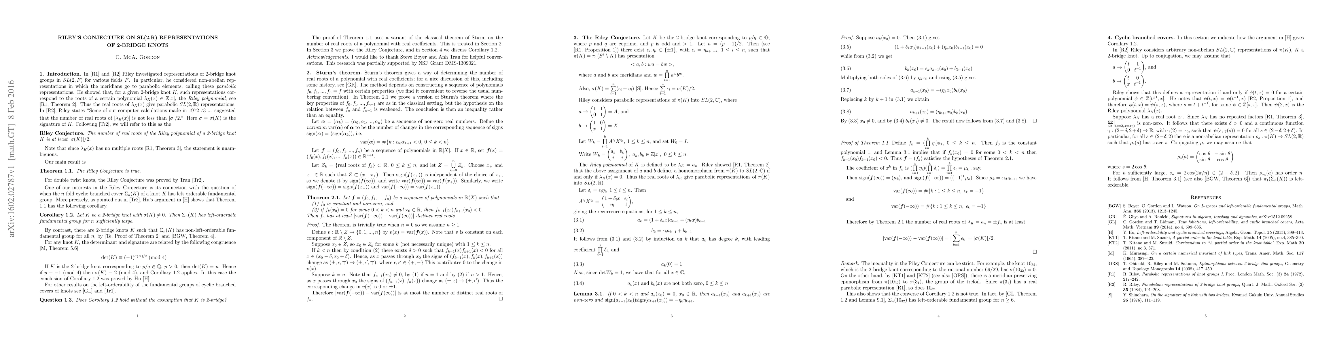 Riley's conjecture on the number of parabolic SL(2,R) representations of 2-bridge knot groups is proven, confirming the existence of a specific count for these representations. This result advances the understanding of the representation theory of knot groups.