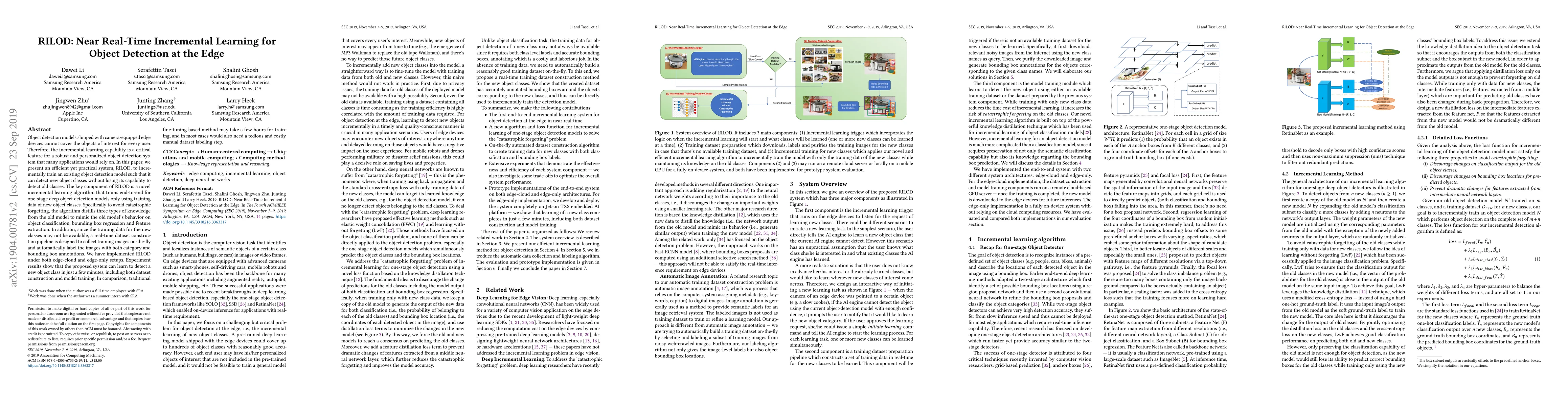 RILOD enables near real-time incremental learning for object detection at the edge, allowing existing models to detect new classes without forgetting old ones. It employs a novel algorithm that distills knowledge from the old model and constructs training datasets on-the-fly, achieving rapid learning in minutes.