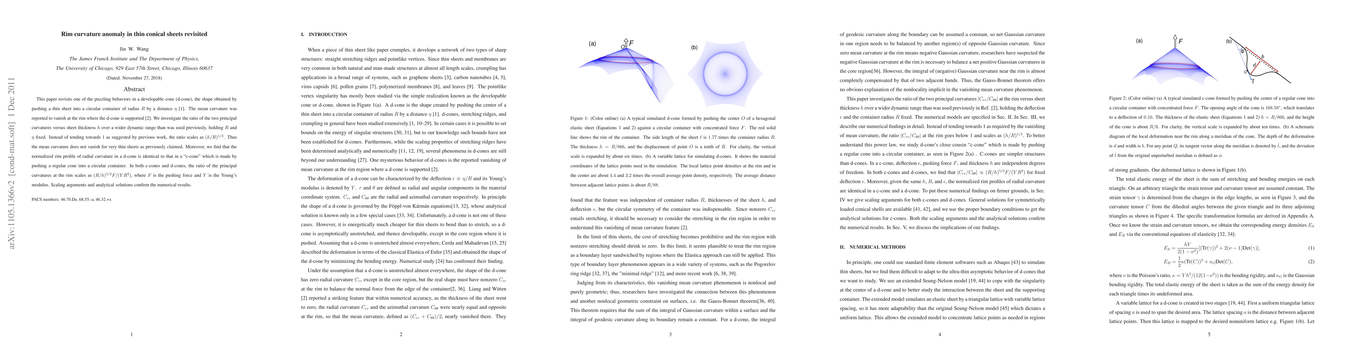 This paper revisits the rim curvature anomaly in thin conical sheets, finding that the ratio of principal curvatures does not approach 1 but scales as $(h/R)^{1/3}$ for very thin sheets, contradicting previous claims of mean curvature vanishing. The normalized rim profile curvature is identical in developable cones and regular cones, with scaling dependent on the pushing force and Young's modulus.