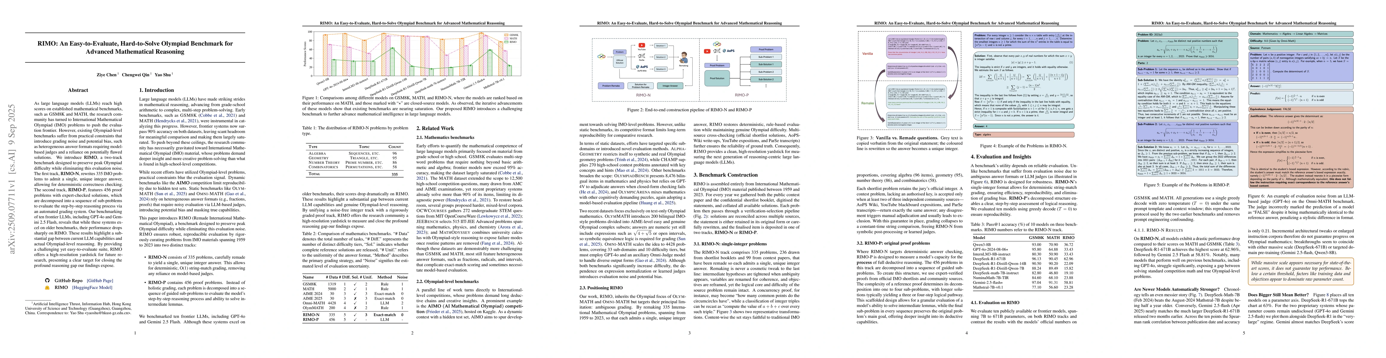 As large language models (LLMs) reach high scores on established mathematical benchmarks, such as GSM8K and MATH, the research community has turned to International Mathematical Olympiad (IMO) problems to push the evaluation frontier. However, existing Olympiad-level benchmarks suffer from practical constraints that introduce grading noise and potential bias, such as heterogeneous answer formats requiring model-based judges and a reliance on potentially flawed solutions. We introduce RIMO, a two-track benchmark designed to preserve peak Olympiad difficulty while eliminating this evaluation noise. The first track, RIMO-N, rewrites 335 IMO problems to admit a single, unique integer answer, allowing for deterministic correctness checking. The second track, RIMO-P, features 456 proof problems with expert-checked solutions, which are decomposed into a sequence of sub-problems to evaluate the step-by-step reasoning process via an automated grading system. Our benchmarking of ten frontier LLMs, including GPT-4o and Gemini 2.5 Flash, reveals that while these systems excel on older benchmarks, their performance drops sharply on RIMO. These results highlight a substantial gap between current LLM capabilities and actual Olympiad-level reasoning. By providing a challenging yet easy-to-evaluate suite, RIMO offers a high-resolution yardstick for future research, presenting a clear target for closing the profound reasoning gap our findings expose.
