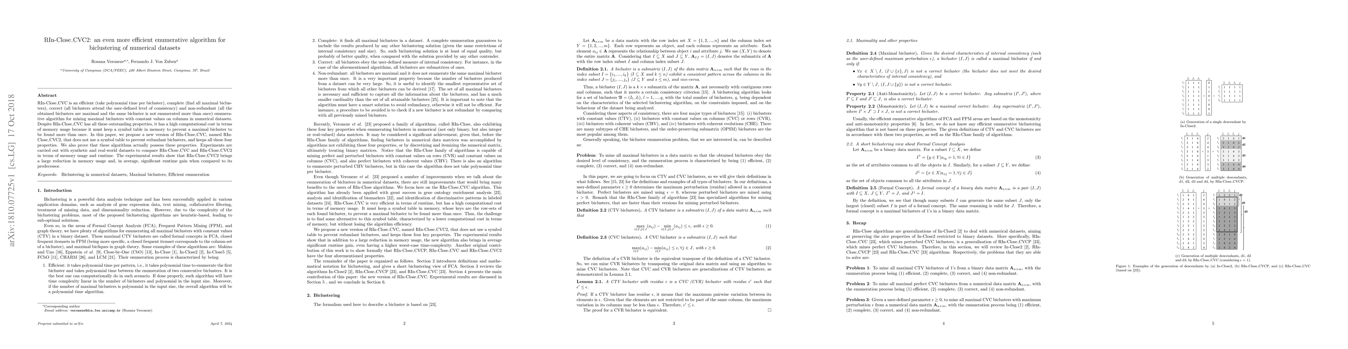RIn-Close_CVC2 is an improved version of the RIn-Close_CVC algorithm for efficient biclustering in numerical datasets, maintaining completeness, correctness, and non-redundancy without using a symbol table, thus significantly reducing memory usage and improving runtime. Experimental results show substantial memory reduction and average runtime gains over the original algorithm.