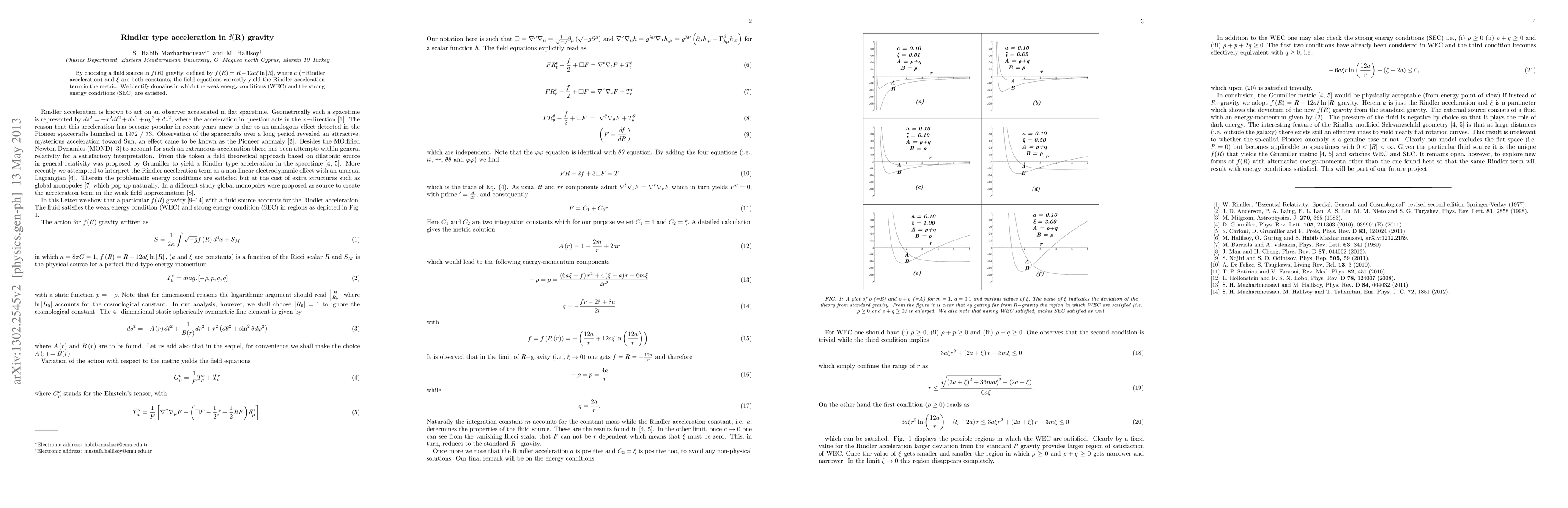 This paper explores $f(R)$ gravity with a specific fluid source, yielding Rindler acceleration in the metric, and investigates the domains where the weak and strong energy conditions are satisfied.