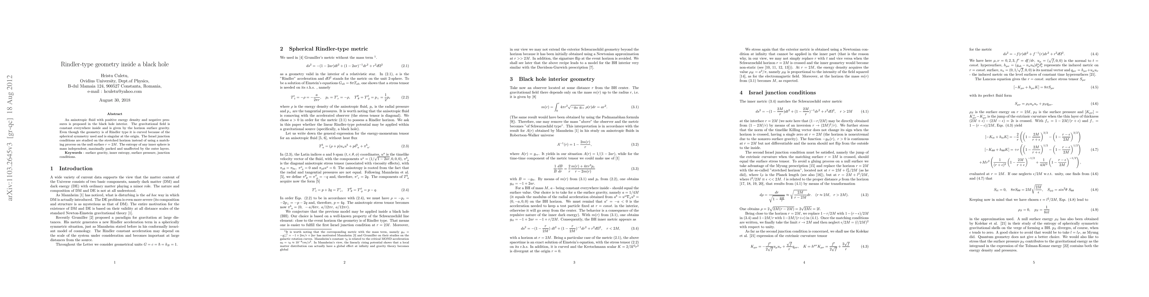 An anisotropic fluid with positive energy density and negative pressures is proposed in the black hole interior. The gravitational field is constant everywhere inside and is given by the horizon surface gravity. Even though the geometry is of Rindler type it is curved because of the spherical symmetry used and is singular at the origin. The Israel junction conditions are studied on the stretched horizon instead of using a matching process on the null surface $r = 2M$. The entropy of any inner sphere is mass independent, maximally packed and unaffected by the outer layers.