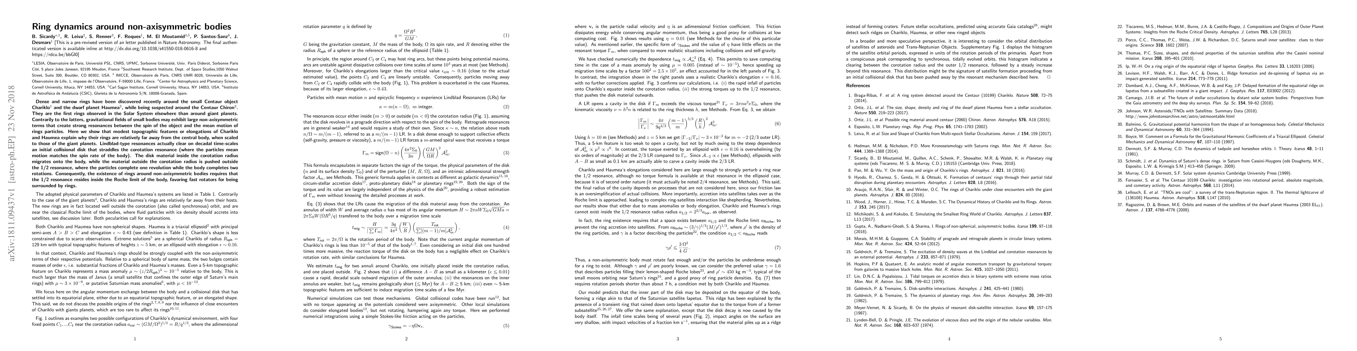 Rings around non-axisymmetric bodies like Chariklo and Haumea can form due to resonances between ring particles and the object's spin, favoring fast rotators with 1/2 resonance inside their Roche limit.