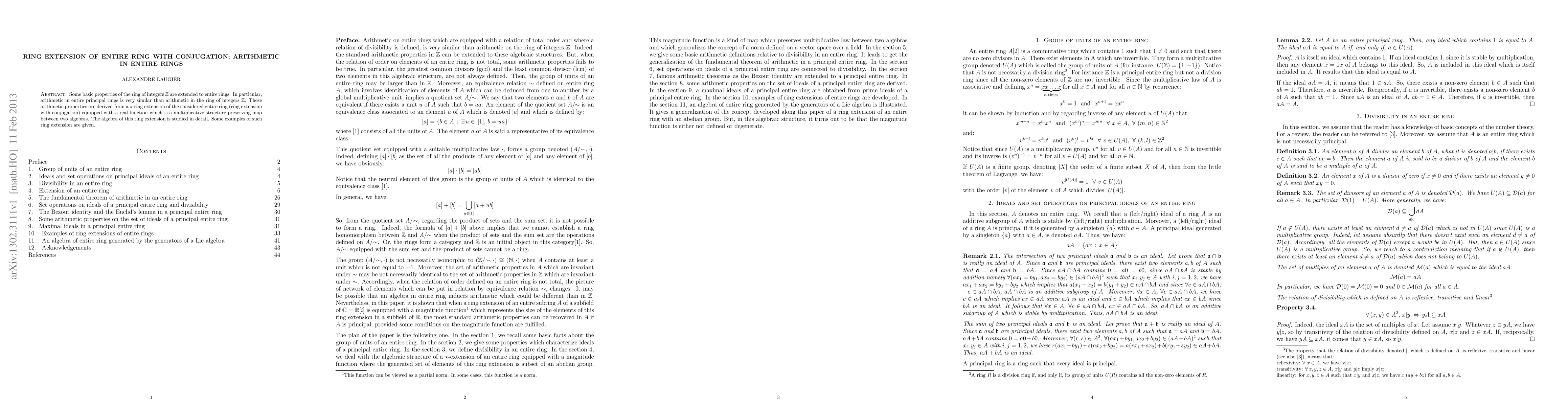 Some basic properties of the ring of integers $\mathbb{Z}$ are extended to entire rings. In particular, arithmetic in entire principal rings is very similar than arithmetic in the ring of integers $\mathbb{Z}$. These arithmetic properties are derived from a $\star$-ring extension of the considered entire ring (ring extension with conjugation) equipped with a real function which is a multiplicative structure-preserving map between two algebras. The algebra of this ring extension is studied in detail. Some examples of such ring extension are given.