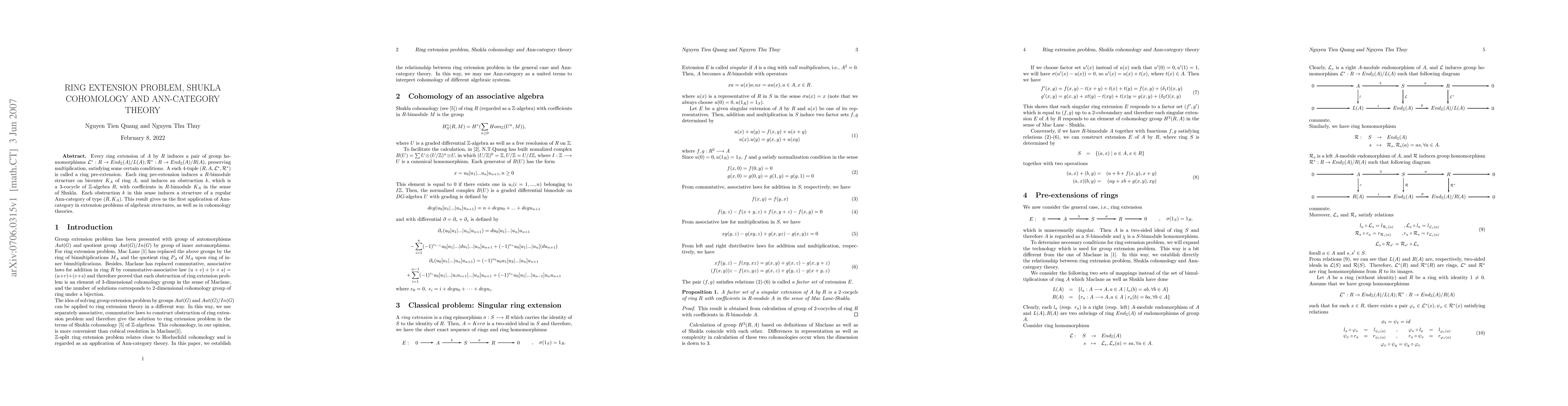 Every ring extension of $A$ by $R$ induces a pair of group homomorphisms $\mathcal{L}^{*}:R\to End_\Z(A)/L(A);\mathcal{R}^{*}:R\to End_\Z(A)/R(A),$ preserving multiplication, satisfying some certain conditions. A such 4-tuple $(R,A,\mathcal{L}^{*},\mathcal{R}^{*})$ is called a ring pre-extension. Each ring pre-extension induces a $R$-bimodule structure on bicenter $K_A$ of ring $A,$ and induces an obstruction $k,$ which is a 3-cocycle of $\Z$-algebra $R,$ with coefficients in $R$-bimodule $K_A$ in the sense of Shukla. Each obstruction $k$ in this sense induces a structure of a regular Ann-category of type $(R,K_A).$ This result gives us the first application of Ann-category in extension problems of algebraic structures, as well as in cohomology theories.