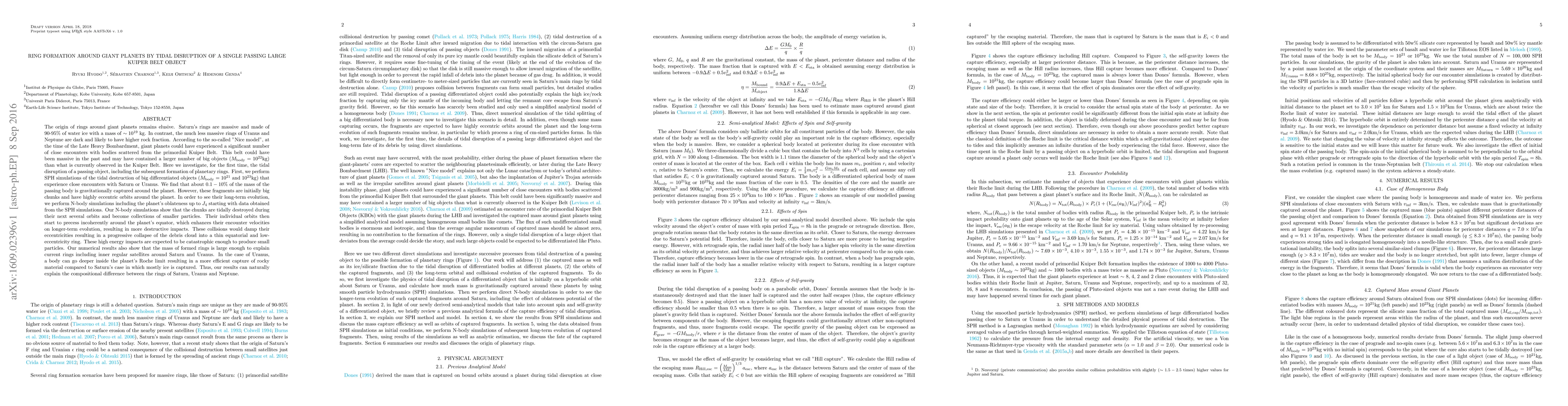 The origin of rings around giant planets remains elusive. Saturn's rings are massive and made of 90-95% of water ice. In contrast, the much less massive rings of Uranus and Neptune are dark and likely to have higher rock fraction. Here we investigate, for the first time, the tidal disruption of a passing object, including the subsequent formation of planetary rings. First, we perform SPH simulations of the tidal destruction of big differentiated objects ($M_{\rm body}=10^{21-23}$) that experience close encounters with Saturn or Uranus. We find that about $0.1-10$% of the mass of the passing body is gravitationally captured around the planet. However, these fragments are initially big chunks and have highly eccentric orbits around the planet. Then, we perform N-body simulations including the planet's oblateness, starting with data obtained from the SPH simulations. Our N-body simulations show that the chunks are tidally destroyed during their next several orbits. Their individual orbits then start to precess incoherently around the planet's equator, which enhances their encounter velocities on longer-term evolution, resulting in more destructive impacts. These collisions would damp their eccentricities resulting in a progressive collapse of the debris cloud into a thin equatorial and low-eccentricity ring. These high energy impacts are expected to be catastrophic enough to produce small particles. Our numerical results also show that the mass of formed rings is large enough to explain current rings including inner regular satellites around Saturn and Uranus. In the case of Uranus, a body can go deeper inside the planet's Roche limit resulting in a more efficient capture of rocky material compared to Saturn's case in which mostly ice is captured. Thus, our results can naturally explain the compositional difference between the rings of Saturn, Uranus and Neptune.