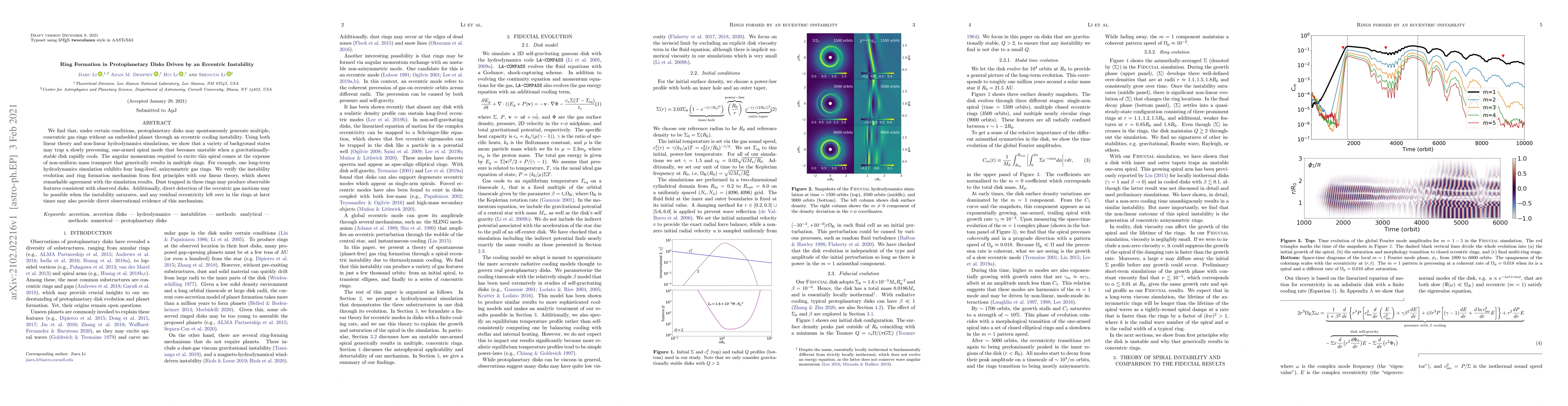 This paper demonstrates that protoplanetary disks can form multiple concentric gas rings via an eccentric cooling instability without an embedded planet. The study combines linear theory and hydrodynamic simulations to show that rapid cooling can trigger an instability that leads to non-uniform mass transport and ring formation, potentially observable through dust features and gas motions.