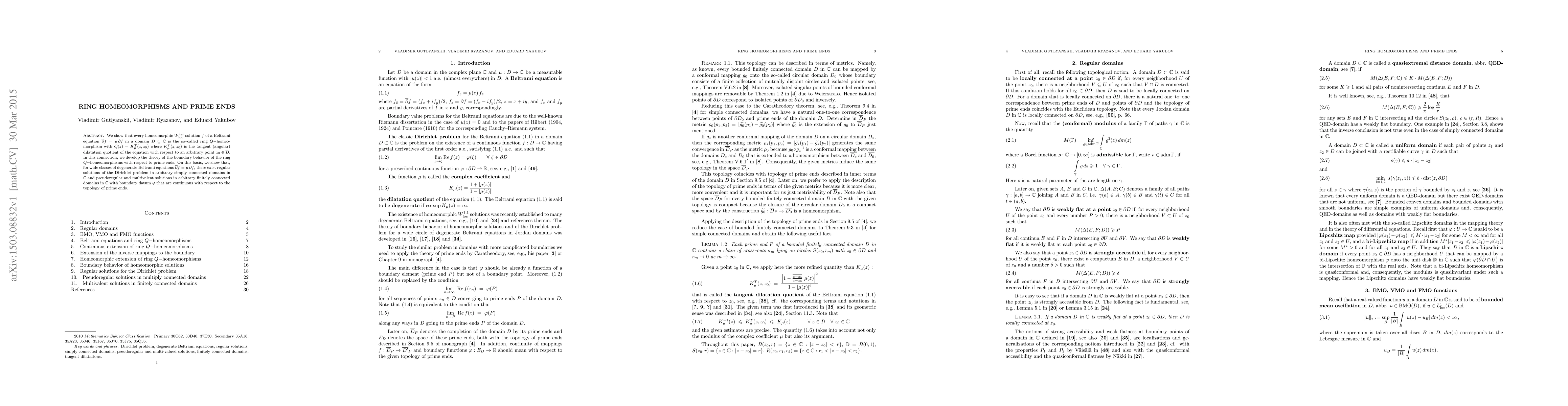We show that every homeomorphic $W^{1,1}_{\rm loc}$ solution $f$ of a Beltrami equation $\overline{\partial}f=\mu\,\partial f$ in a domain $D\subseteq\Bbb C$ is the so--called ring $Q-$homeomorphism with $Q(z)=K^T_{\mu}(z, z_0)$ where $K^T_{\mu}(z, z_0)$ is the tangent (angular) dilatation quotient of the equation with respect to an arbitrary point $z_0\in {\overline{D}}$. In this connection, we develop the theory of the boundary behavior of the ring $Q-$homeomorphisms with respect to prime ends. On this basis, we show that, for wide classes of degenerate Beltrami equations $\overline{\partial}f=\mu\,\partial f$, there exist regular solutions of the Dirichlet problem in arbitrary simply connected domains in $\Bbb C$ and pseudoregular and multivalent solutions in arbitrary finitely connected domains in $\Bbb C$ with boundary datum $\varphi$ that are continuous with respect to the topology of prime ends.