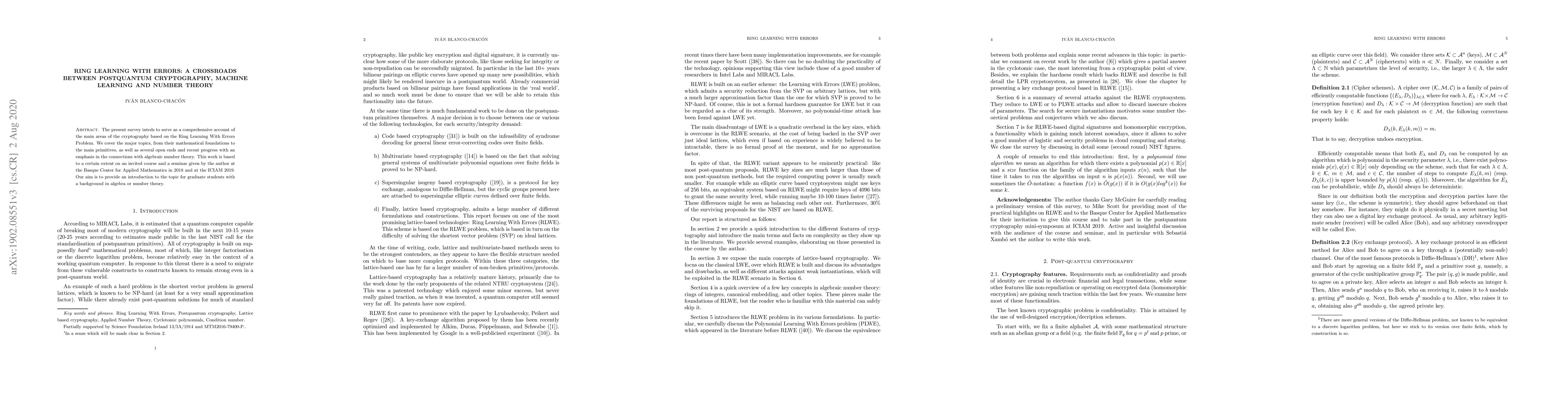 This paper surveys cryptographic functionalities based on the ring learning with errors problem, highlighting its connections to postquantum cryptography, machine learning, and algebraic number theory. It draws from an invited lecture series presented at the Basque Center for Applied Mathematics in 2018.