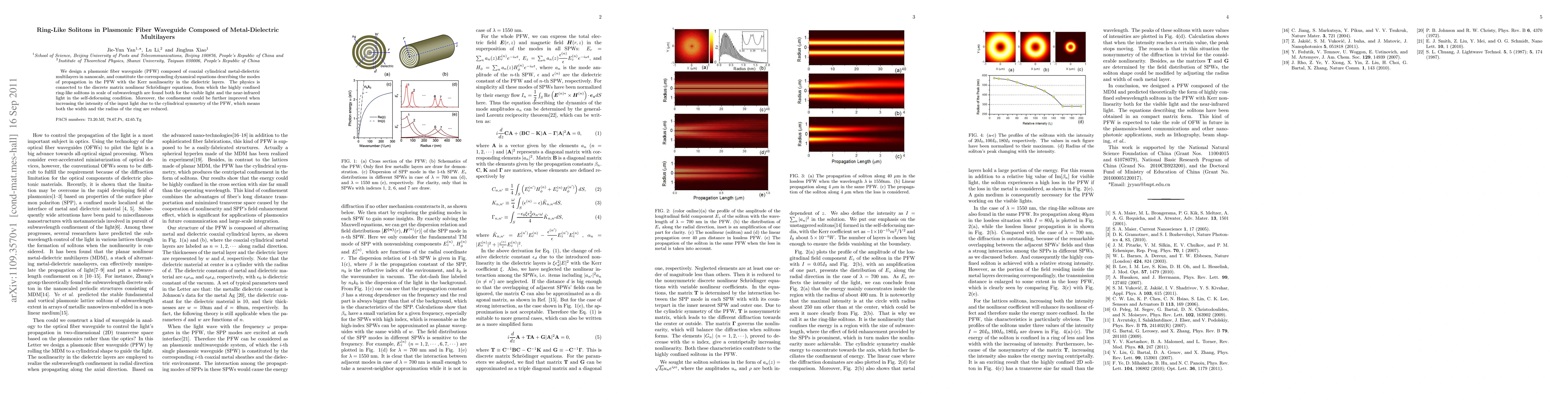 This paper designs a nanoscale plasmonic fiber waveguide made of coaxial metal-dielectric multilayers and finds highly confined ring-like solitons in visible and near-infrared light due to Kerr nonlinearity. The soliton confinement improves with increased input light intensity, reducing both the ring width and radius.