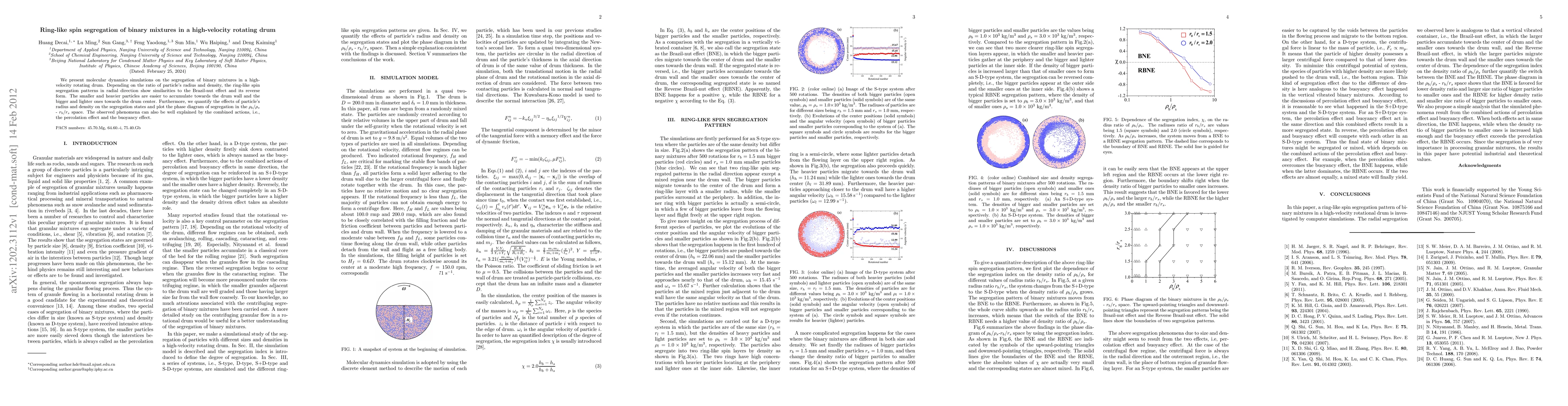 We present molecular dynamics simulations on the segregation of binary mixtures in a high-velocity rotating drum. Depending on the ratio of particle's radius and density, the ring-like spin segregation patterns in radial direction show similarities to the Brazil-nut effect and its reverse form. The smaller and heavier particles are easier to accumulate towards the drum wall and the bigger and lighter ones towards the drum center. Furthermore, we quantify the effects of particle's radius and density on the segregation states and plot the phase diagram of segregation in the ${\rho_b}/{\rho_s}$ - ${r_b}/{r_s}$ space. The observed phenomena can also be well explained by the combined actions, i.e., the percolation effect and the buoyancy effect.