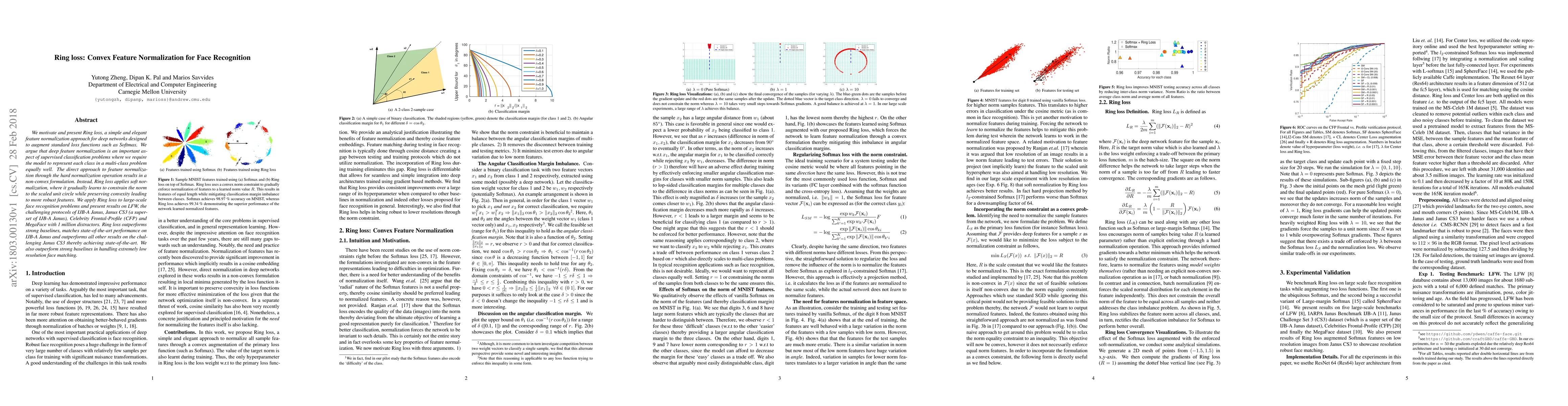 Ring loss introduces a convex feature normalization method for deep networks to enhance face recognition, achieving state-of-the-art results on large-scale datasets like LFW, IJB-A Janus, Janus CS3, CFP, and MegaFace. It outperforms strong baselines by preserving convexity and robustness in feature normalization.