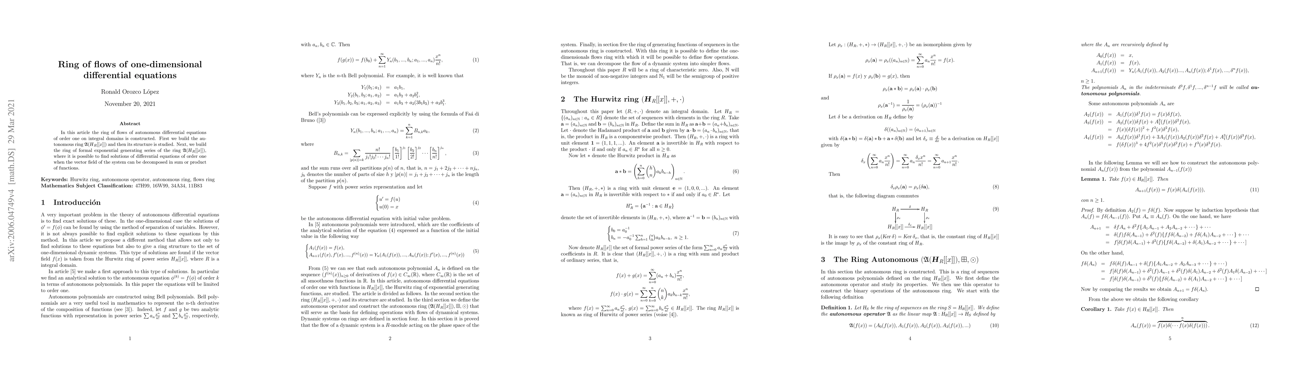 This paper constructs the ring of flows of autonomous first-order differential equations on integral domains, establishing the autonomous ring $\Opa(\hurw_{R}[[x]])$ and exploring its structure. It further develops the ring of formal exponential generating series to find solutions for systems where vector fields can be decomposed.
