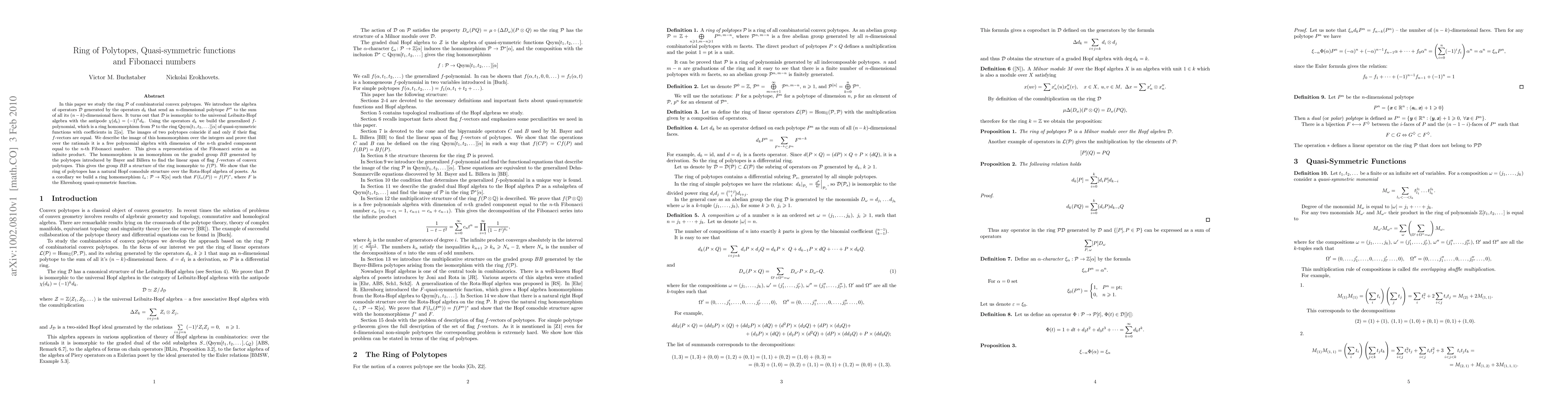 This paper establishes a connection between the ring of combinatorial convex polytopes and quasi-symmetric functions using operators $d_k$. It introduces an isomorphism to the universal Leibnitz-Hopf algebra, constructs a generalized $f$-polynomial, and reveals a representation of Fibonacci numbers as an infinite product over rationals. The study also describes the image of this homomorphism over integers and demonstrates an isomorphism on the graded group $BB$. Furthermore, it uncovers a natural Hopf comodule structure of the polytopes' ring over the Rota-Hopf algebra of posets.