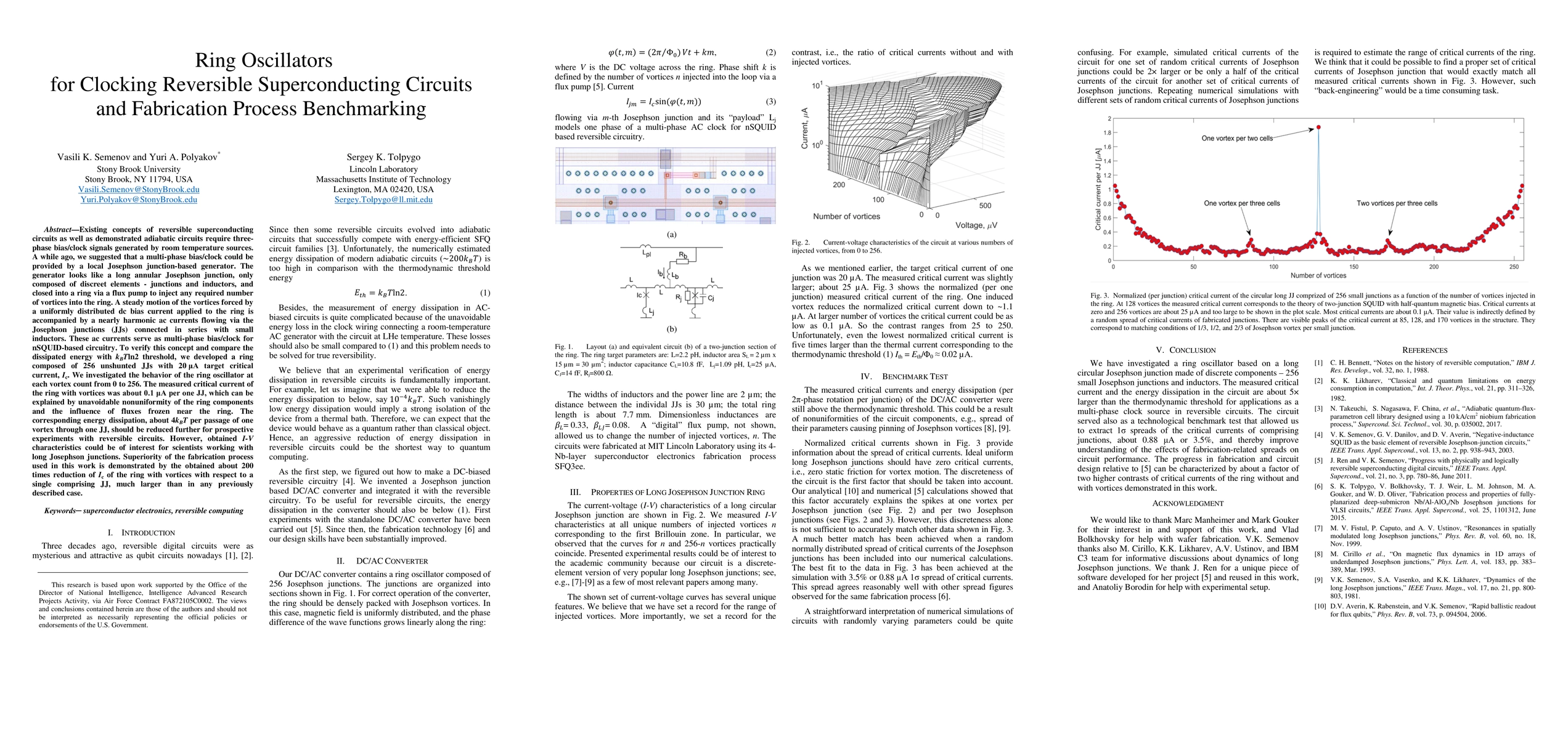 Existing concepts of reversible superconducting circuits as well as demonstrated adiabatic circuits require three-phase bias/clock signals generated by room temperature sources. A while ago, we suggested that a multi-phase bias/clock could be provided by a local Josephson junction-based generator. The generator looks like a long annular Josephson junction, only composed of discreet elements - junctions and inductors, and closed into a ring via a flux pump to inject any required number of vortices into the ring. A steady motion of the vortices forced by a uniformly distributed dc bias current applied to the ring is accompanied by a nearly harmonic ac currents flowing via the Josephson junctions (JJs) connected in series with small inductors. These ac currents serve as multi-phase bias/clock for nSQUID-based circuitry. To verify this concept and compare the dissipated energy with kBTln2 threshold, we developed a ring composed of 256 unshunted JJs with 20 {\mu}A target critical current, Ic. We investigated the behavior of the ring oscillator at each vortex count from 0 to 256. The measured critical current of the ring with vortices was about 0.1 {\mu}A per one JJ, which can be explained by unavoidable nonuniformity of the ring components and the influence of fluxes frozen near the ring. The corresponding energy dissipation, about 10kBT per passage of one vortex through one JJ, should be reduced further for prospective experiments with reversible circuits. However, obtained I-V characteristics could be of interest for scientists working with long Josephson junctions. Superiority of the fabrication process used in this work is demonstrated by the obtained about 200 times reduction of Ic of the ring with vortices with respect to a single comprising JJ, much larger than in any previously described case.