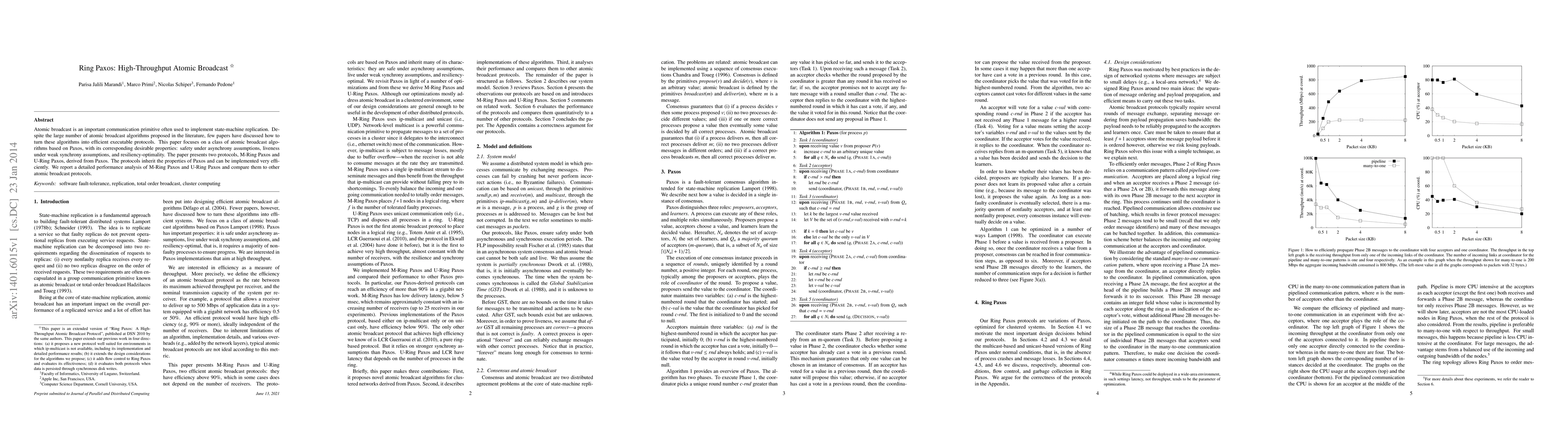 Ring Paxos presents two efficient protocols, M-Ring Paxos and U-Ring Paxos, derived from Paxos for high-throughput atomic broadcast, maintaining its desirable properties while offering improved performance compared to other protocols. The paper provides a detailed performance analysis and comparison.