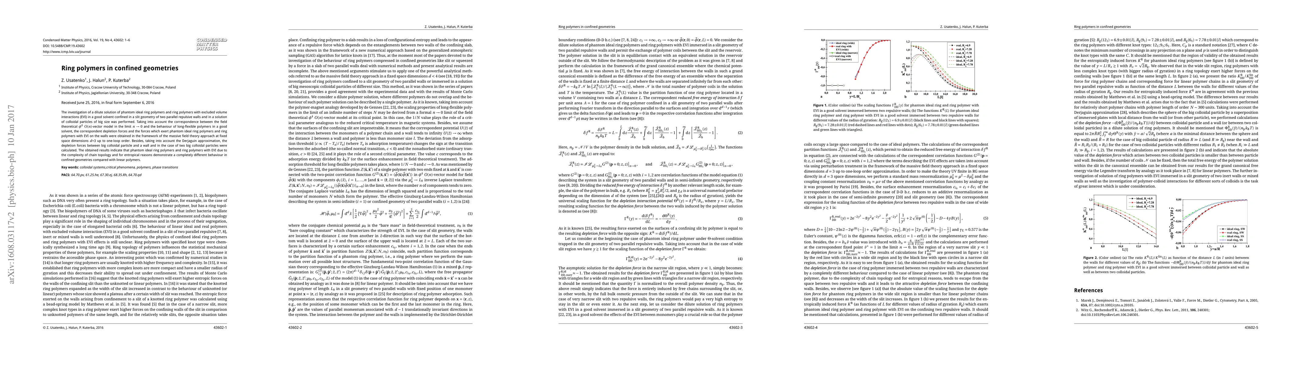This paper investigates the behavior of ring polymers in confined geometries, comparing phantom ideal rings and those with excluded volume interactions. It reveals that these ring polymers exhibit distinct entropic behaviors compared to linear polymers due to their topological complexity, as analyzed through field theory and the Derjaguin approximation.
