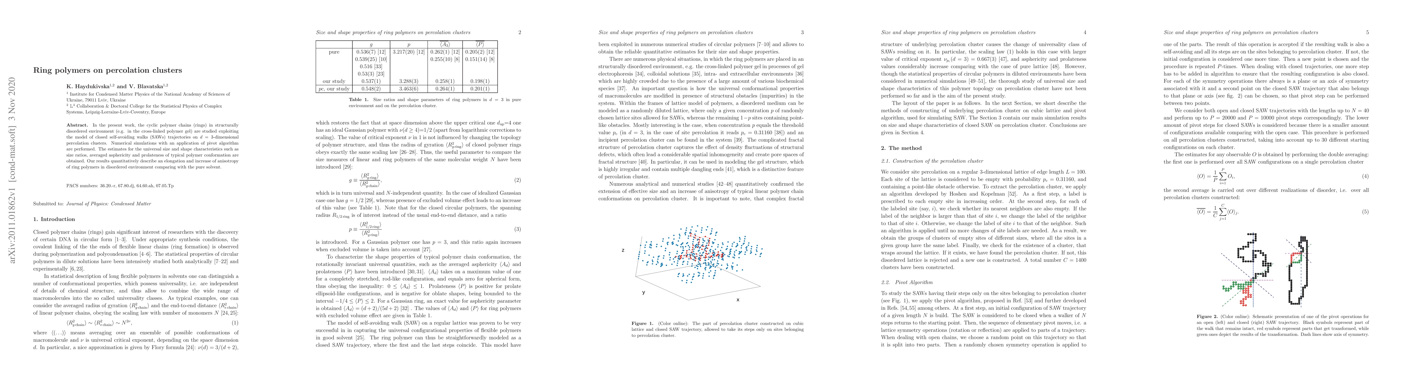 In the present work, the cyclic polymer chains (rings) in structurally disordered environment (e.g. in the cross-linked polymer gel) are studied exploiting the model of closed self-avoiding walks (SAWs) trajectories on $d=3$-dimensional percolation clusters. Numerical simulations with an application of pivot algorithm are performed. The estimates for the universal size and shape characteristics such as size ratios, averaged asphericity and prolateness of typical polymer conformation are obtained. Our results quantitatively describe an elongation and increase of anisotropy of ring polymers in disordered environment comparing with the pure solvent.