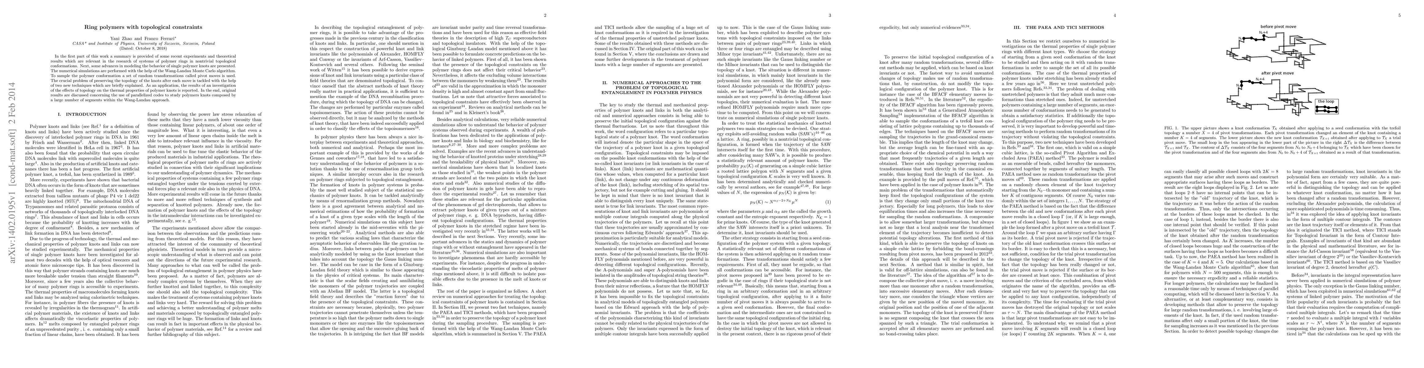 In the first part of this work a summary is provided of some recent experiments and theoretical results which are relevant in the research of systems of polymer rings in nontrivial topological conformations. Next, some advances in modeling the behavior of single polymer knots are presented. The numerical simulations are performed with the help of the Wang-Landau Monte Carlo algorithm. To sample the polymer conformation a set of random transformations called pivot moves is used. The crucial problem of preserving the topology of the knots after each move is tackled with the help of two new techniques which are briefly explained. As an application, the results of an investigation of the effects of topology on the thermal properties of polymer knots is reported. In the end, original results are discussed concerning the use of parallelized codes to study polymers knots composed by a large number of segments within the Wang-Landau approach.
