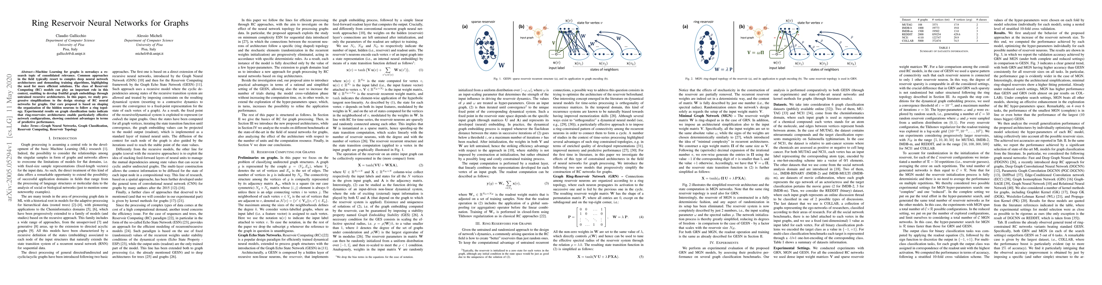 This paper explores the use of ring reservoir neural networks for graph classification, proposing a simplified Reservoir Computing approach that organizes hidden neurons in a ring topology. Experimental results show that this configuration offers consistent advantages in predictive performance compared to traditional deep neural networks.