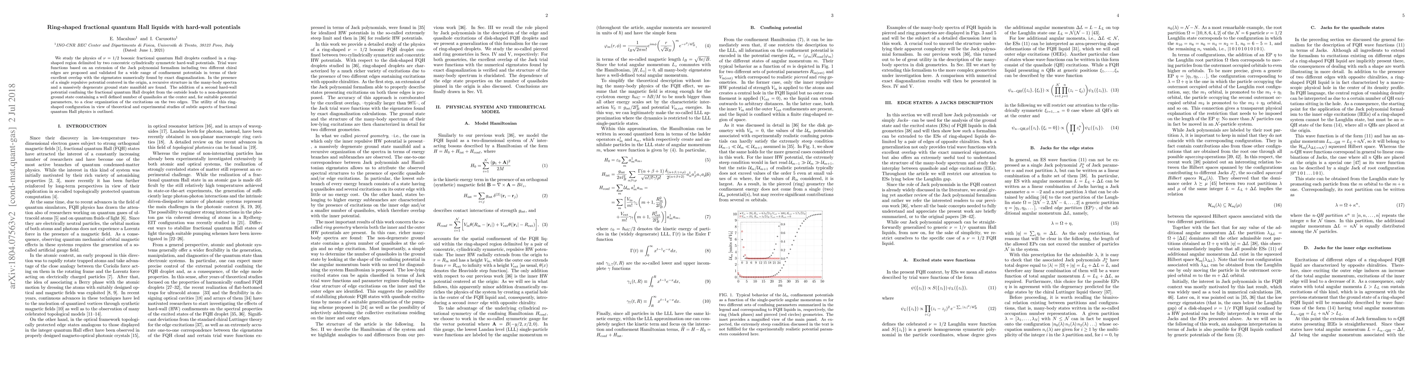 This paper investigates the physics of $\nu=1/2$ bosonic fractional quantum Hall droplets confined in a ring-shaped geometry defined by hard-wall potentials. It proposes trial wave functions based on Jack polynomial formalism and finds a recursive structure in the spectra and a degenerate ground state under a single potential, while a second potential leads to a non-degenerate ground state with quasiholes and organized excitations.