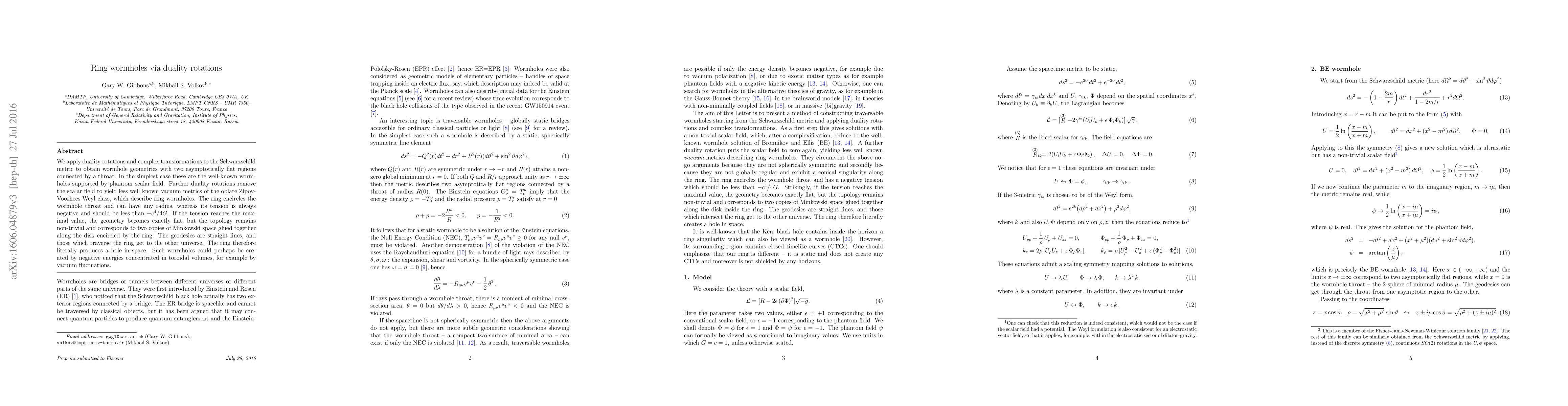 We apply duality rotations and complex transformations to the Schwarzschild metric to obtain wormhole geometries with two asymptotically flat regions connected by a throat. In the simplest case these are the well-known wormholes supported by phantom scalar field. Further duality rotations remove the scalar field to yield less well known vacuum metrics of the oblate Zipoy-Voorhees-Weyl class, which describe ring wormholes. The ring encircles the wormhole throat and can have any radius, whereas its tension is always negative and should be less than $-c^4/4G$. If the tension reaches the maximal value, the geometry becomes exactly flat, but the topology remains non-trivial and corresponds to two copies of Minkowski space glued together along the disk encircled by the ring. The geodesics are straight lines, and those which traverse the ring get to the other universe. The ring therefore literally produces a hole in space. Such wormholes could perhaps be created by negative energies concentrated in toroidal volumes, for example by vacuum fluctuations.