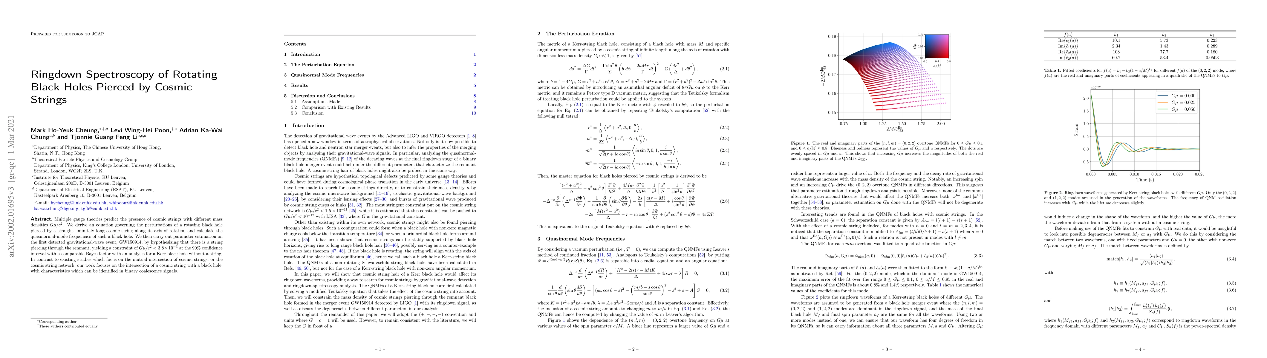 Multiple gauge theories predict the presence of cosmic strings with different mass densities $G\mu/c^2$. We derive an equation governing the perturbations of a rotating black hole pierced by a straight, infinitely long cosmic string along its axis of rotation and calculate the quasinormal-mode frequencies of such a black hole. We then carry out parameter estimation on the first detected gravitational-wave event, GW150914, by hypothesizing that there is a string piercing through the remnant, yielding a constraint of $G\mu/c^2 <3.8\times 10^{-3}$ at the 90\% confidence interval with a comparable Bayes factor with an analysis for a Kerr black hole without a string. In contrast to existing studies which focus on the mutual intersection of cosmic strings, or the cosmic string network, our work focuses on the intersection of a cosmic string with a black hole, with characteristics which can be identified in binary coalescence signals.