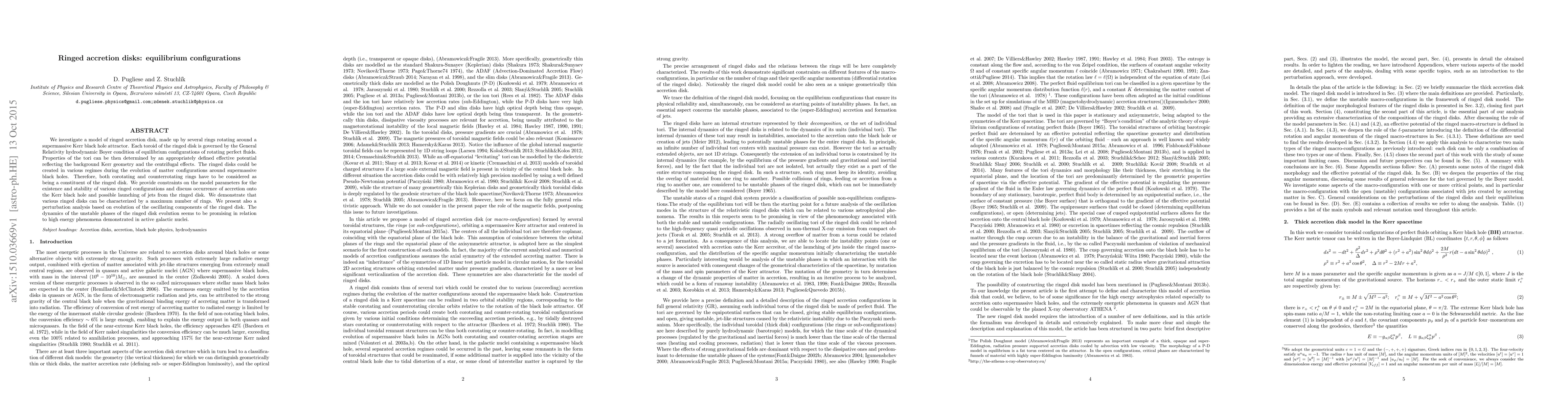 This paper explores the equilibrium configurations of ringed accretion disks around Kerr black holes, governed by General Relativity hydrodynamics. It examines the stability and dynamics of both corotating and counterrotating rings, providing constraints on model parameters and discussing accretion and jet launching.