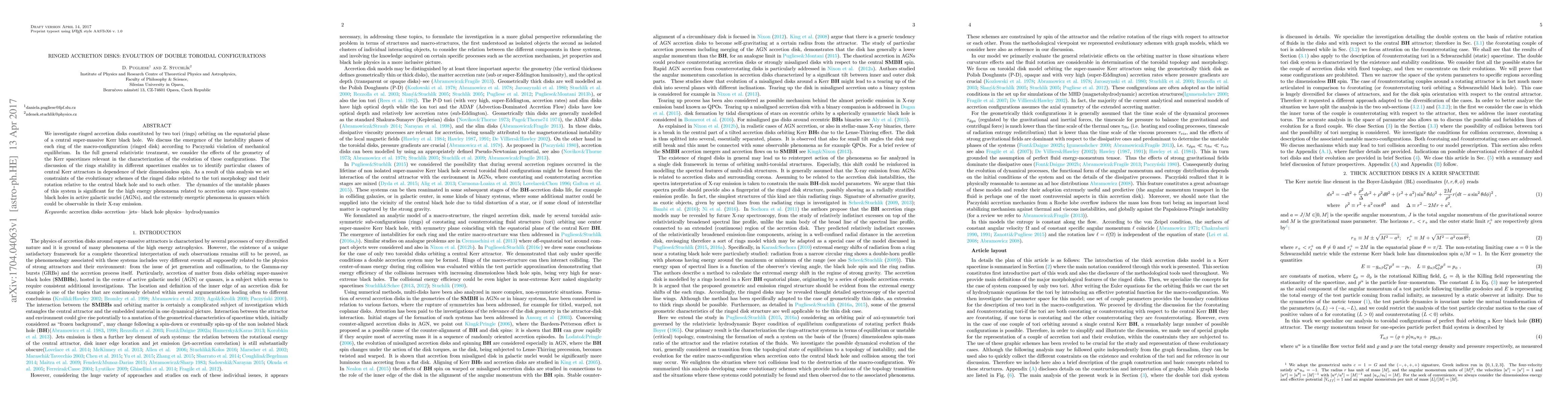 We investigate ringed accretion disks constituted by two tori (rings) orbiting on the equatorial plane of a central super-massive Kerr black hole. We discuss the emergence of the instability phases of each ring of the macro-configuration (ringed disk) according to Paczynski violation of mechanical equilibrium. In the full general relativistic treatment, we consider the effects of the geometry of the Kerr spacetimes relevant in the characterization of the evolution of these configurations. The discussion of the rings stability in different spacetimes enables us to identify particular classes of central Kerr attractors in dependence of their dimensionless spin. As a result of this analysis we set constraints of the evolutionary schemes of the ringed disks related to the tori morphology and their rotation relative to the central black hole and to each other. The dynamics of the unstable phases of this system is significant for the high energy phenomena related to accretion onto super-massive black holes in active galactic nuclei (AGNs), and the extremely energetic phenomena in quasars which could be observable in their X-ray emission.