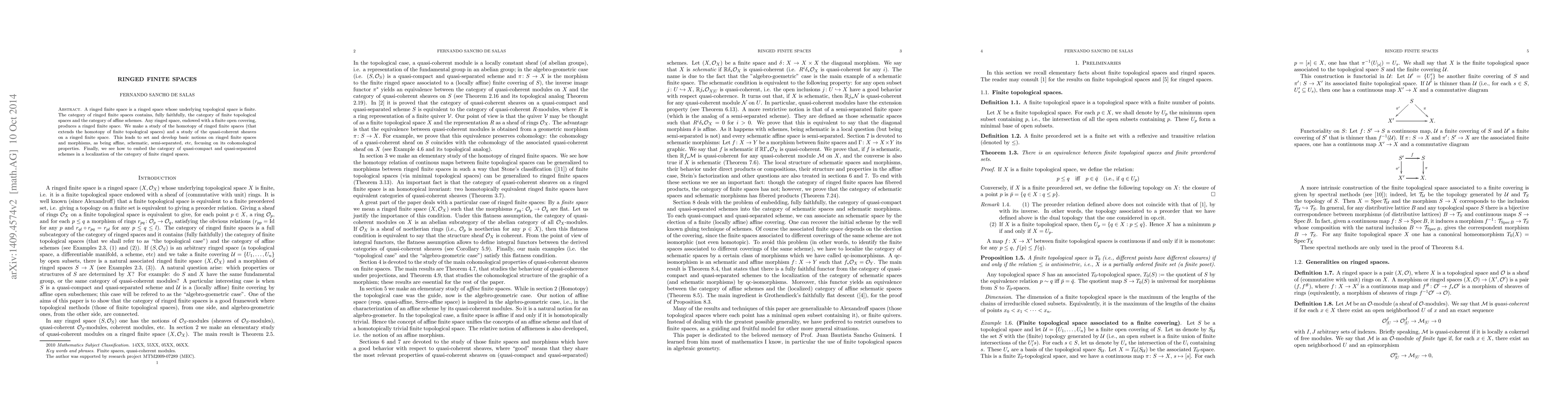 This paper explores the category of ringed finite spaces, embedding finite topological spaces and affine schemes within it. It studies homotopy and quasi-coherent sheaves, establishing cohomological properties and morphisms such as affine, schematic, and semi-separated, culminating in the embedding of quasi-compact and quasi-separated schemes in this framework.