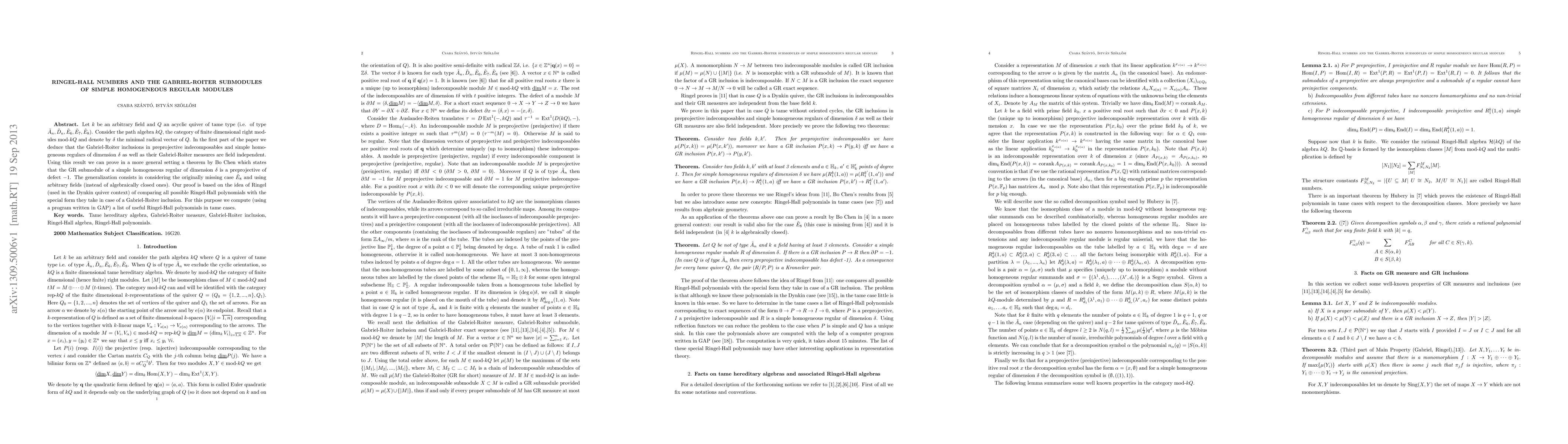 Let k be an arbitrary field and Q an acyclic quiver of tame type. Consider the path algebra kQ and the category of finite dimensional right modules Mod kQ. In the first part of the paper we deduce that the Gabriel-Roiter inclusions in preprojective indecomposables and simple homogeneous regulars (with dimension the minimal radical vector) as well as their Gabriel-Roiter measures are field independent. Using this result we can prove in a more general setting a theorem by Bo Chen which states that the Gabriel-Roiter submodule of a simple homogeneous regular (with dimension the minimal radical vector) is a preprojective indecomposable of defect -1. The generalization consists in considering the originally missing case $\tilde E_8$ and using arbitrary fields (instead of algebraically closed ones). Our proof is based on the idea of Ringel (used in the Dynkin quiver context) of comparing all possible Ringel-Hall polynomials with the special form they take in case of a Gabriel-Roiter inclusion. For this purpose we compute (using a program written in GAP) a list of useful Ringel-Hall polynomials in tame cases.