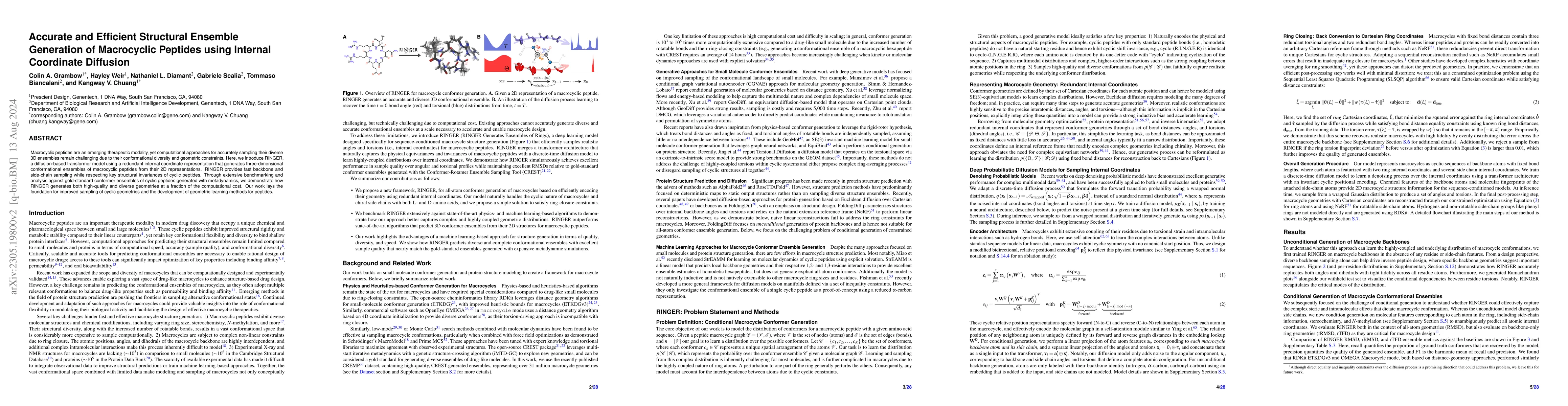 RINGER is a novel diffusion-based transformer model designed for rapid generation of diverse macrocycle structures by leveraging sequence-conditioned internal coordinate diffusion. It efficiently samples cyclic peptide geometries while respecting structural constraints, offering high-quality conformers at a significantly reduced computational cost compared to traditional methods.