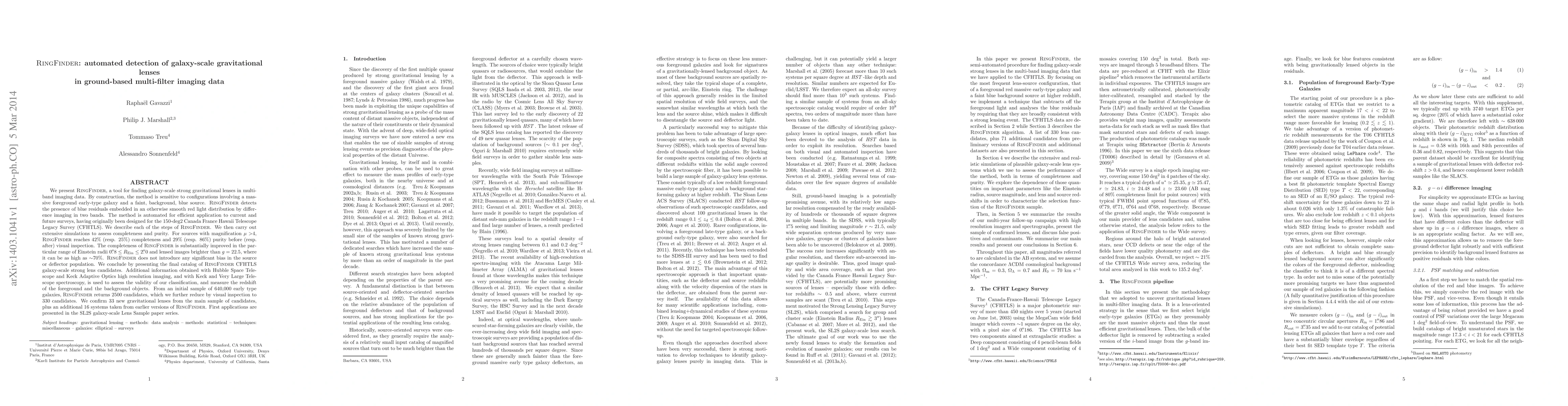 RingFinder is an automated tool for detecting galaxy-scale gravitational lenses in multi-filter imaging data, identifying configurations involving massive foreground galaxies and faint background sources. The method achieves high completeness and purity for lensed images brighter than g=22.5, confirming 49 new gravitational lenses from an initial sample of 640,000 early-type galaxies.