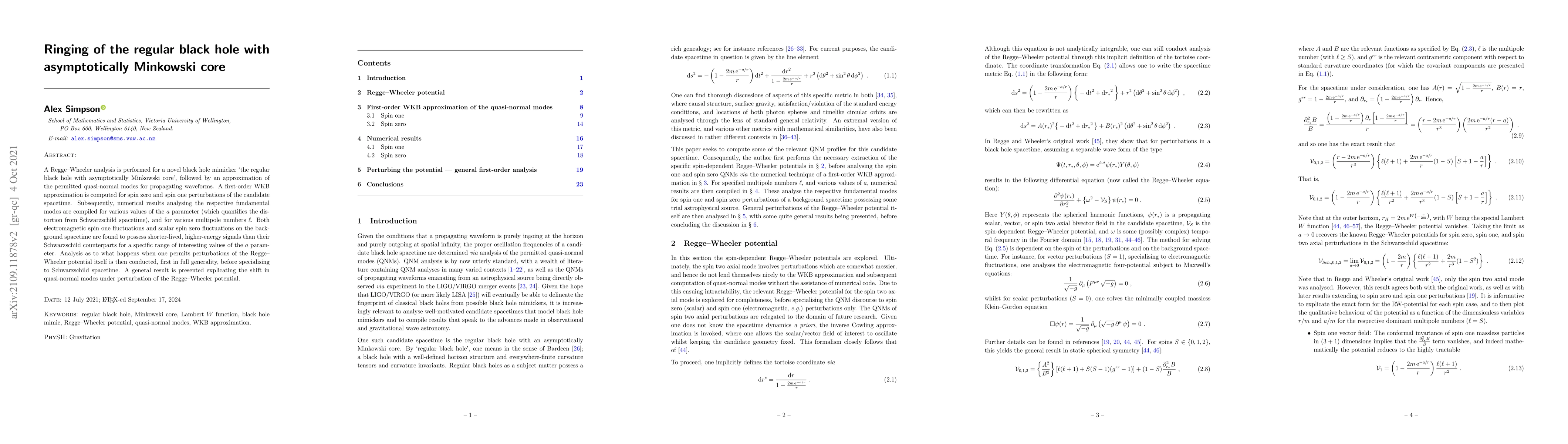 A Regge--Wheeler analysis is performed for a novel black hole mimicker `the regular black hole with asymptotically Minkowski core', followed by an approximation of the permitted quasi-normal modes for propagating waveforms. A first-order WKB approximation is computed for spin zero and spin one perturbations of the candidate spacetime. Subsequently, numerical results analysing the respective fundamental modes are compiled for various values of the $a$ parameter (which quantifies the distortion from Schwarzschild spacetime), and for various multipole numbers $\ell$. Both electromagnetic spin one fluctuations and scalar spin zero fluctuations on the background spacetime are found to possess shorter-lived, higher-energy signals than their Schwarzschild counterparts for a specific range of interesting values of the $a$ parameter. Analysis as to what happens when one permits perturbations of the Regge--Wheeler potential itself is then conducted, first in full generality, before specialising to Schwarzschild spacetime. A general result is presented explicating the shift in quasi-normal modes under perturbation of the Regge--Wheeler potential.