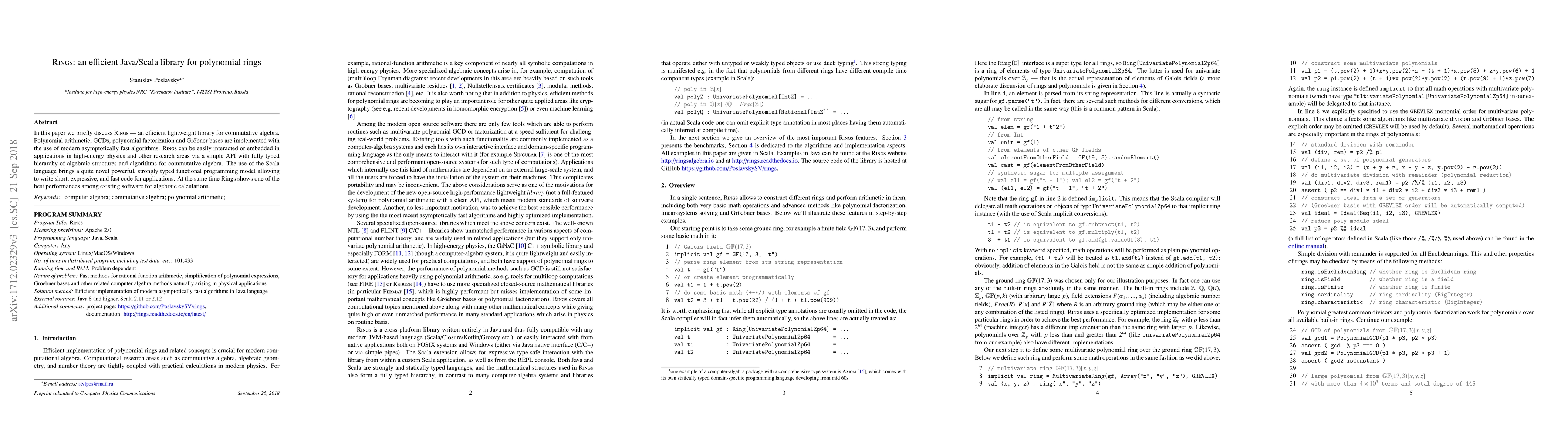In this paper we briefly discuss \Rings --- an efficient lightweight library for commutative algebra. Polynomial arithmetic, GCDs, polynomial factorization and Gr\"obner bases are implemented with the use of modern asymptotically fast algorithms. \Rings can be easily interacted or embedded in applications in high-energy physics and other research areas via a simple API with fully typed hierarchy of algebraic structures and algorithms for commutative algebra. The use of the Scala language brings a quite novel powerful, strongly typed functional programming model allowing to write short, expressive, and fast code for applications. At the same time Rings shows one of the best performances among existing software for algebraic calculations. \Rings is available from http://github.com/PoslavskySV/rings