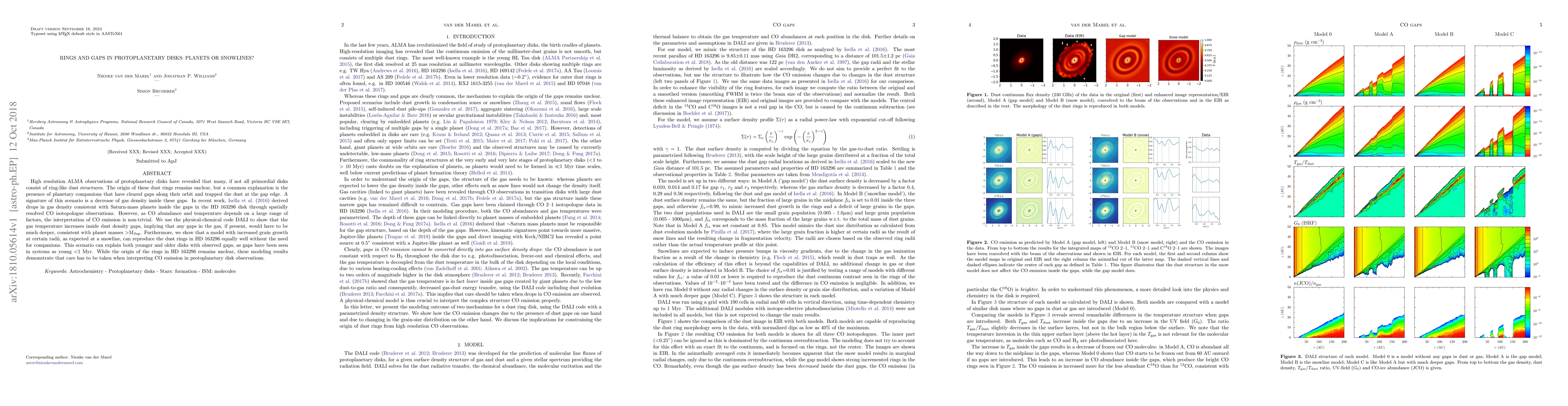 High-resolution ALMA observations reveal ring-like dust structures in protoplanetary disks, traditionally attributed to planets creating gaps. However, modeling suggests that increased grain growth at snowlines can equally reproduce these rings without requiring planetary companions, highlighting the complexity of interpreting CO emission in disk observations.