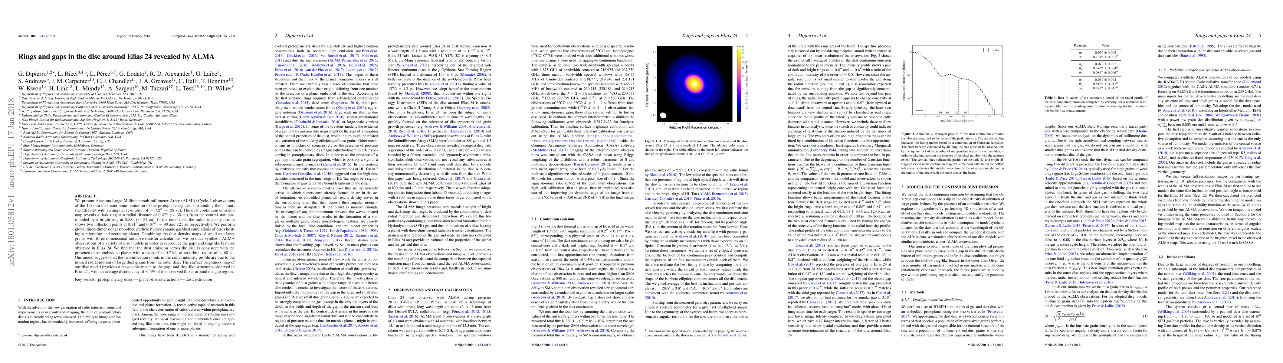 We present Atacama Large Millimeter/sub-millimeter Array (ALMA) Cycle 2 observations of the 1.3 mm dust continuum emission of the protoplanetary disc surrounding the T Tauri star Elias 24 with an angular resolution of $\sim 0.2"$ ($\sim 28$ au). The dust continuum emission map reveals a dark ring at a radial distance of $0.47"$ ($\sim 65$ au) from the central star, surrounded by a bright ring at $0.58"$ ($\sim 81$ au). In the outer disc, the radial intensity profile shows two inflection points at $0.71"$ and $0.87"$ ($\sim 99$ and $121$ au respectively). We perform global three-dimensional smoothed particle hydrodynamic gas/dust simulations of discs hosting a migrating and accreting planet. Combining the dust density maps of small and large grains with three dimensional radiative transfer calculations, we produce synthetic ALMA observations of a variety of disc models in order to reproduce the gap- and ring-like features observed in Elias 24. We find that the dust emission across the disc is consistent with the presence of an embedded planet with a mass of $\sim 0.7\, \mathrm{M_{\mathrm{J}}}$ at an orbital radius of $\sim$ 60 au. Our model suggests that the two inflection points in the radial intensity profile are due to the inward radial motion of large dust grains from the outer disc. The surface brightness map of our disc model provides a reasonable match to the gap- and ring-like structures observed in Elias 24, with an average discrepancy of $\sim$ 5% of the observed fluxes around the gap region.