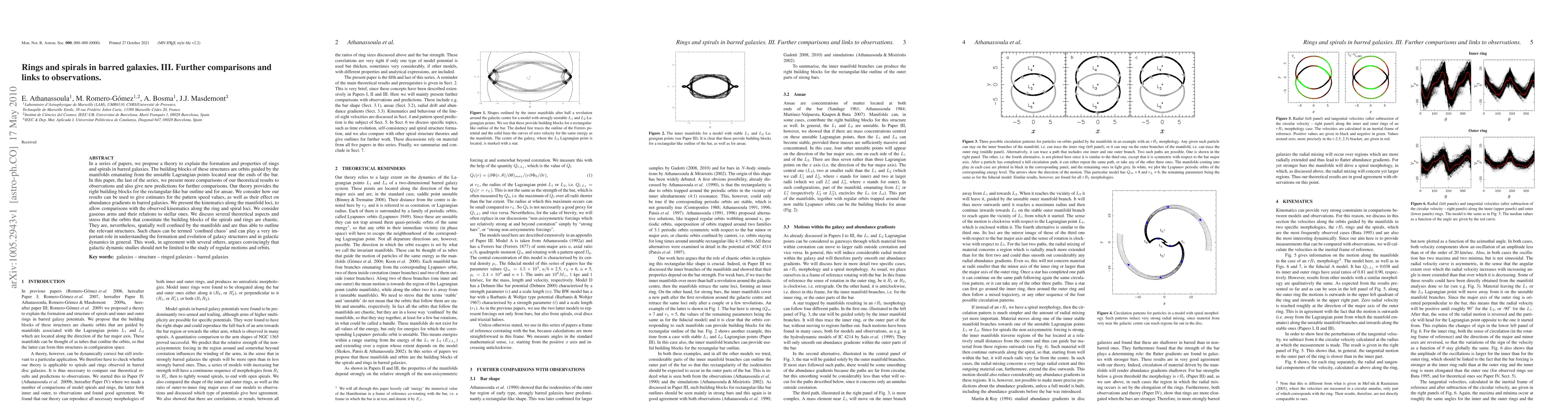 This paper concludes a series explaining the formation of rings and spirals in barred galaxies through chaotic yet confined orbits near bar's unstable Lagrangian points. It compares theoretical predictions with observations and discusses implications for pattern speed estimates and galactic dynamics.