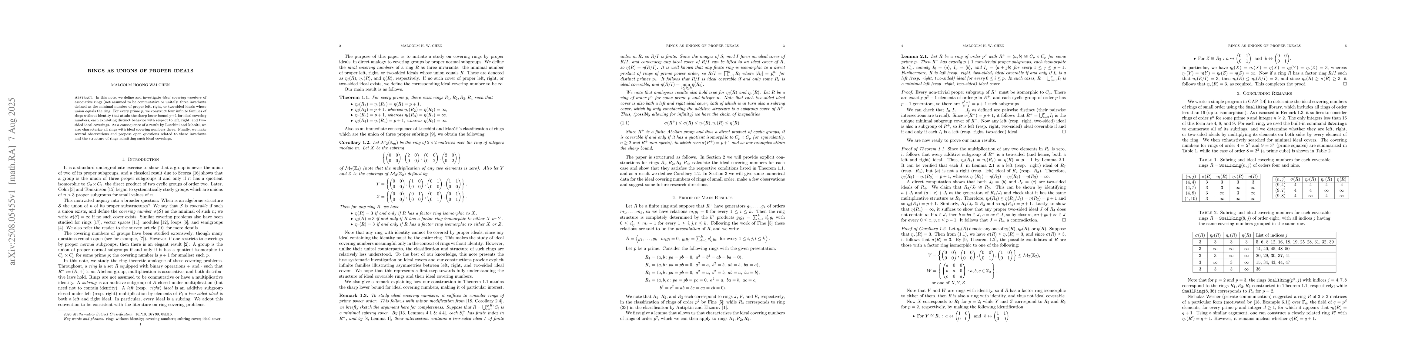 In this note, we define and investigate $\textit{ideal covering numbers}$ of associative rings (not assumed to be commutative or unital): three invariants defined as the minimal number of proper left, right, or two-sided ideals whose union equals the ring. For every prime $p$, we construct four infinite families of rings without identity that attain the sharp lower bound $p + 1$ for ideal covering numbers, each exhibiting distinct behavior with respect to left, right, and two-sided ideal coverings. As a consequence of a result by Lucchini and Mar\'{o}ti, we also characterize all rings with ideal covering numbers three. Finally, we make several observations and propose open questions related to these invariants and the structure of rings admitting such ideal coverings.