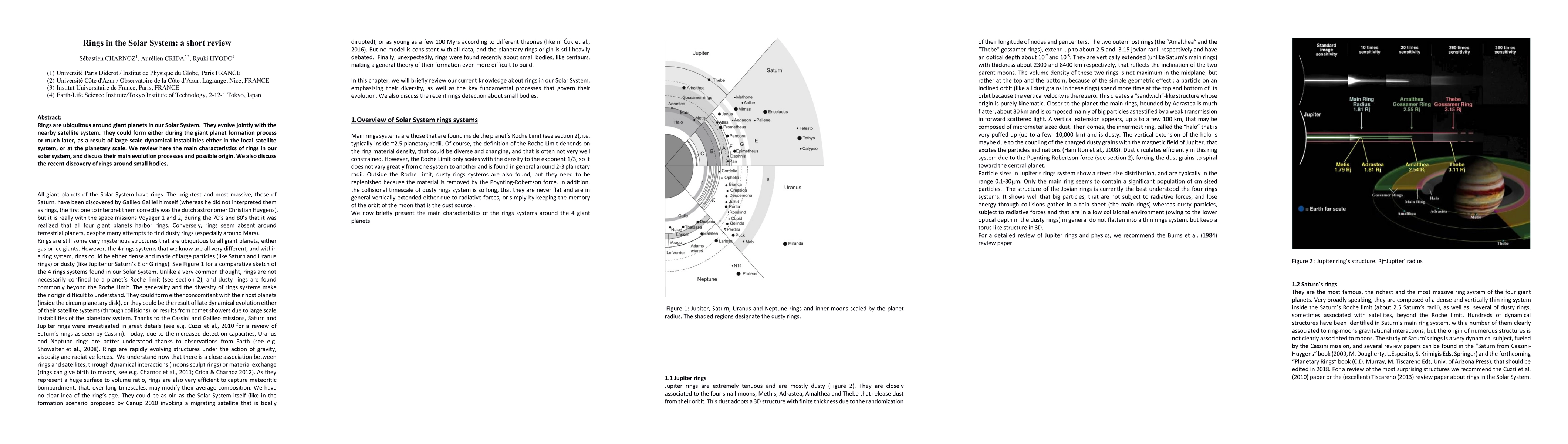 This paper reviews the characteristics and evolution of rings in the Solar System, focusing on their formation during giant planet formation or later due to dynamical instabilities, and highlights recent discoveries of rings around small celestial bodies.
