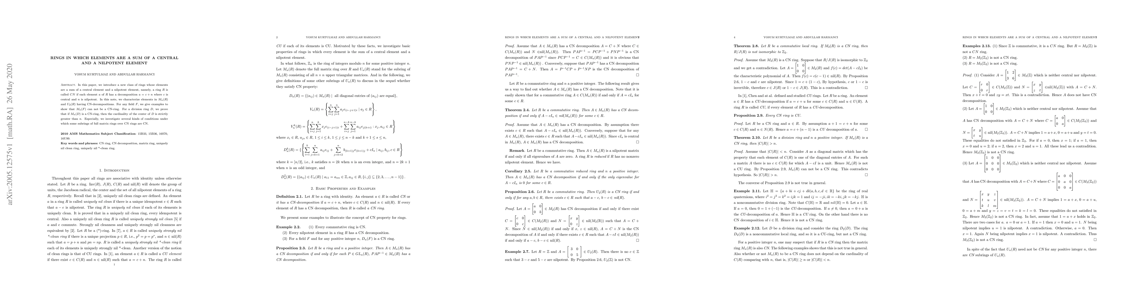This paper introduces a class of rings, called CN-rings, where each element can be decomposed into a central element plus a nilpotent element. It explores properties of CN-decompositions in matrix and specific subrings, proving that $M_n(F)$ cannot be a CN-ring for any field $F$ and showing that if $M_n(D)$ is a CN-ring for a division ring $D$, the center of $D$ must have a cardinality greater than $n$.