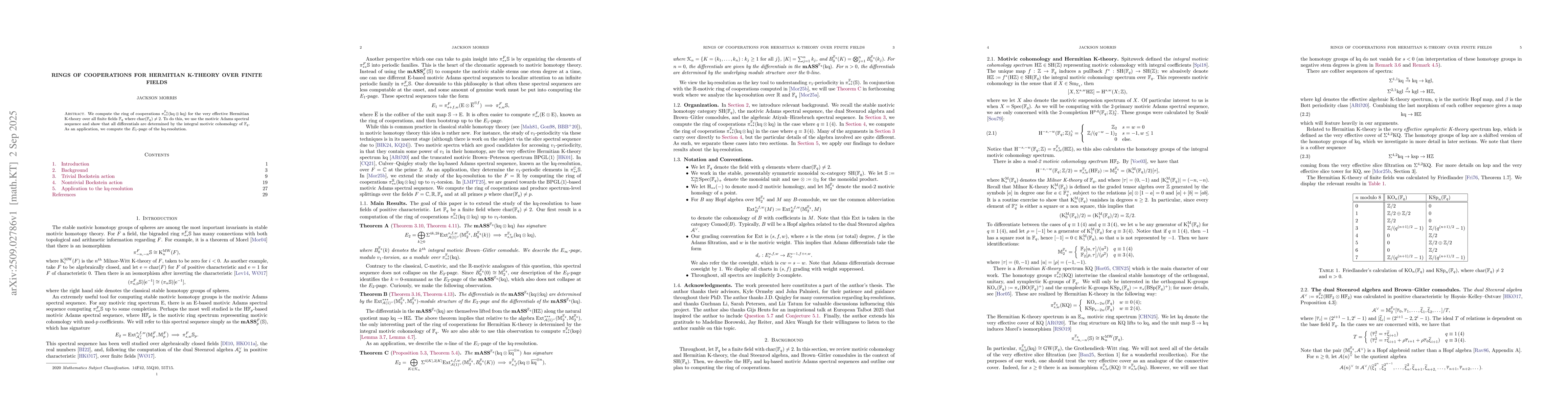 We compute the ring of cooperations $\pi_{**}^{\mathbb{F}_q}(\text{kq} \otimes \text{kq})$ for the very effective Hermitian K-theory over all finite fields $\mathbb{F}_q$ where $\text{char}(\mathbb{F}_q) \neq 2.$ To do this, we use the motivic Adams spectral sequence and show that all differentials are determined by the integral motivic cohomology of $\mathbb{F}_q$. As an application, we compute the $E_1$-page of the kq-resolution.