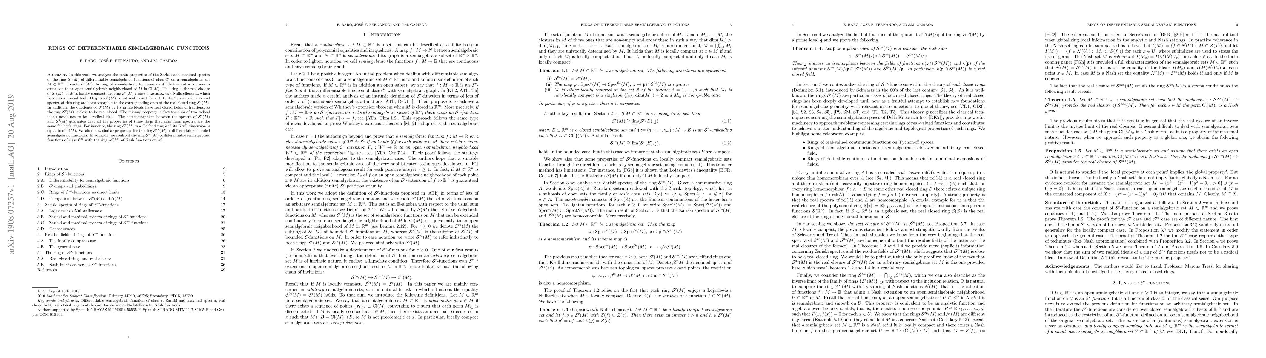 In this work we analyze the main properties of the Zariski and maximal spectra of the ring ${\mathcal S}^r(M)$ of differentiable semialgebraic functions of class ${\mathcal C}^r$ on a semialgebraic set $M\subset\mathbb{R}^m$. Denote ${\mathcal S}^0(M)$ the ring of semialgebraic functions on $M$ that admit a continuous extension to an open semialgebraic neighborhood of $M$ in $\text{cl}(M)$. This ring is the real closure of ${\mathcal S}^r(M)$. If $M$ is locally compact, the ring ${\mathcal S}^r(M)$ enjoys a Lojasiewicz's Nullstellensatz, which becomes a crucial tool. Despite ${\mathcal S}^r(M)$ is not real closed for $r\geq1$, the Zariski and maximal spectra of this ring are homeomorphic to the corresponding ones of the real closed ring ${\mathcal S}^0(M)$. In addition, the quotients of ${\mathcal S}^r(M)$ by its prime ideals have real closed fields of fractions, so the ring ${\mathcal S}^r(M)$ is close to be real closed. The missing property is that the sum of two radical ideals needs not to be a radical ideal. The homeomorphism between the spectra of ${\mathcal S}^r(M)$ and ${\mathcal S}^0(M)$ guarantee that all the properties of these rings that arise from spectra are the same for both rings. For instance, the ring ${\mathcal S}^r(M)$ is a Gelfand ring and its Krull dimension is equal to $\dim(M)$. We also show similar properties for the ring ${\mathcal S}^{r*}(M)$ of differentiable bounded semialgebraic functions. In addition, we confront the ring ${\mathcal S}^{\infty}(M)$ of differentiable semialgebraic functions of class ${\mathcal C}^{\infty}$ with the ring ${\mathcal N}(M)$ of Nash functions on $M$.