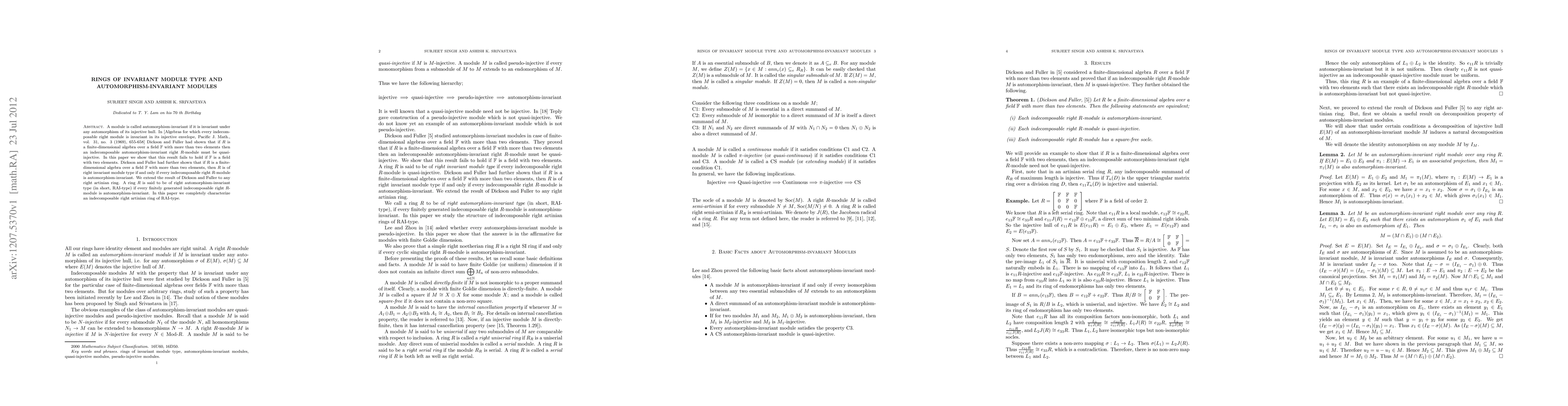 A module is called automorphism-invariant if it is invariant under any automorphism of its injective hull. In [Algebras for which every indecomposable right module is invariant in its injective envelope, Pacific J. Math., vol. 31, no. 3 (1969), 655-658] Dickson and Fuller had shown that if $R$ is a finite-dimensional algebra over a field $\mathbb F$ with more than two elements then an indecomposable automorphism-invariant right $R$-module must be quasi-injective. In this paper we show that this result fails to hold if $\mathbb F$ is a field with two elements. Dickson and Fuller had further shown that if $R$ is a finite-dimensional algebra over a field $\mathbb F$ with more than two elements, then $R$ is of right invariant module type if and only if every indecomposable right $R$-module is automorphism-invariant. We extend the result of Dickson and Fuller to any right artinian ring. A ring $R$ is said to be of right automorphism-invariant type (in short, RAI-type) if every finitely generated indecomposable right $R$-module is automorphism-invariant. In this paper we completely characterize an indecomposable right artinian ring of RAI-type.