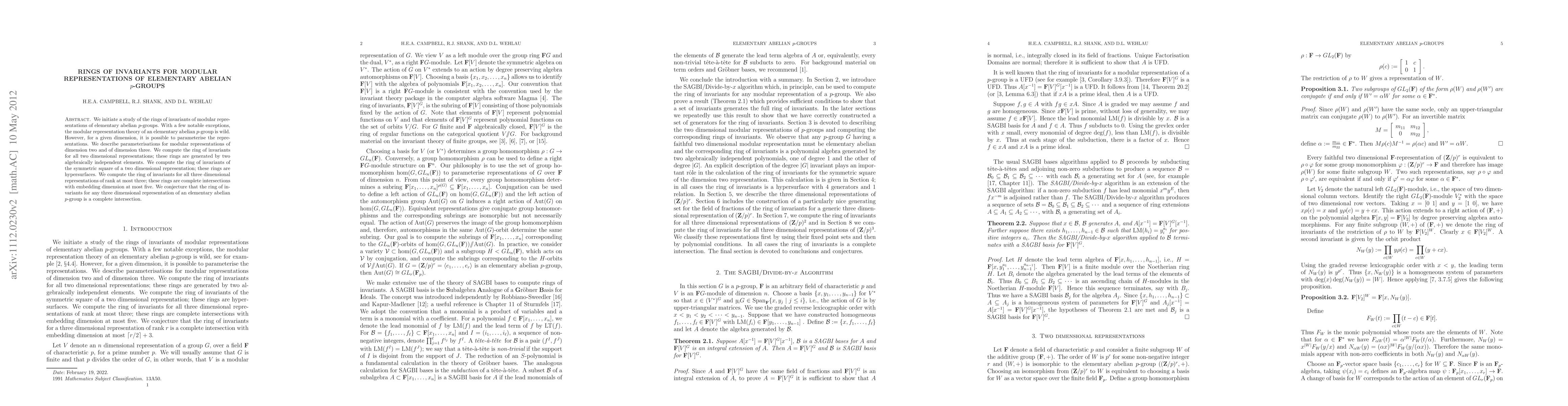 This research explores the rings of invariants for modular representations of elementary abelian p-groups, particularly focusing on dimensions two and three. It finds that the invariants for two-dimensional representations are generated by two independent elements, while those for the symmetric square are hypersurfaces. For three-dimensional representations, the invariants are complete intersections, leading to a conjecture that all such three-dimensional representations have complete intersection rings of invariants.